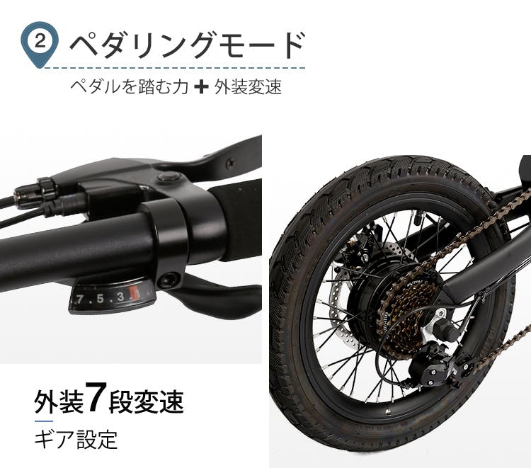【内装変速】と【外装変速】を組み合わせて、電源が切れた場合でも、スイスイ走行可能。機能性に優れるだけでなく、3ステップで折りたたんでコンパクトになる使いやすさやオシャレな見た目にも配慮した車体設計です。