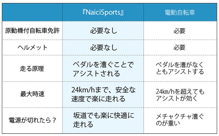 そんなお客様の声に耳を傾けながら、免許不要なバッテリーが切れた場合でも普通の自転車に乗る感覚のように、ラクに快適に走れる次世代の折りたたみ式電動アシスト自転車『NaiciSports』が登場!