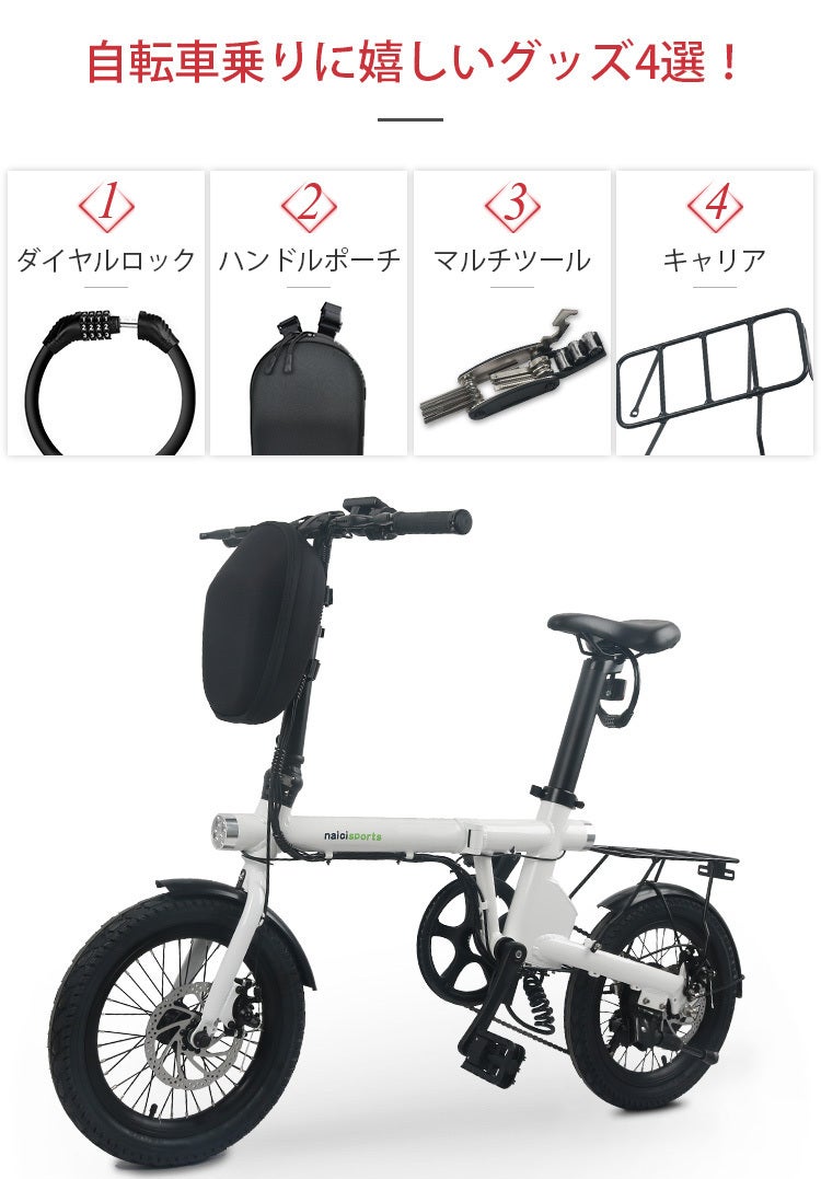『NaiciSports』に任意の番号をセットできるダイヤルロック、ペットボトルや小物がたくさん入るハンドルポーチ、使い勝手抜群のマルチツール、便利なキャリアを取り付けて、安心かつ快適な電動アシスト自転車ライフをお楽しみください♪