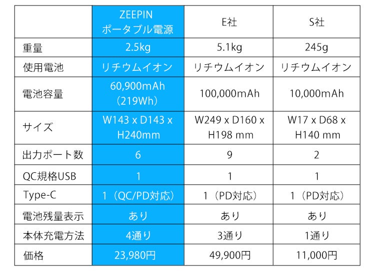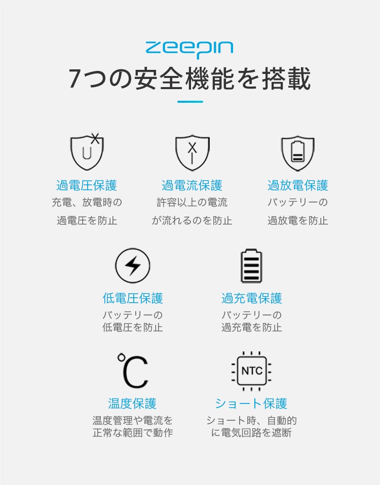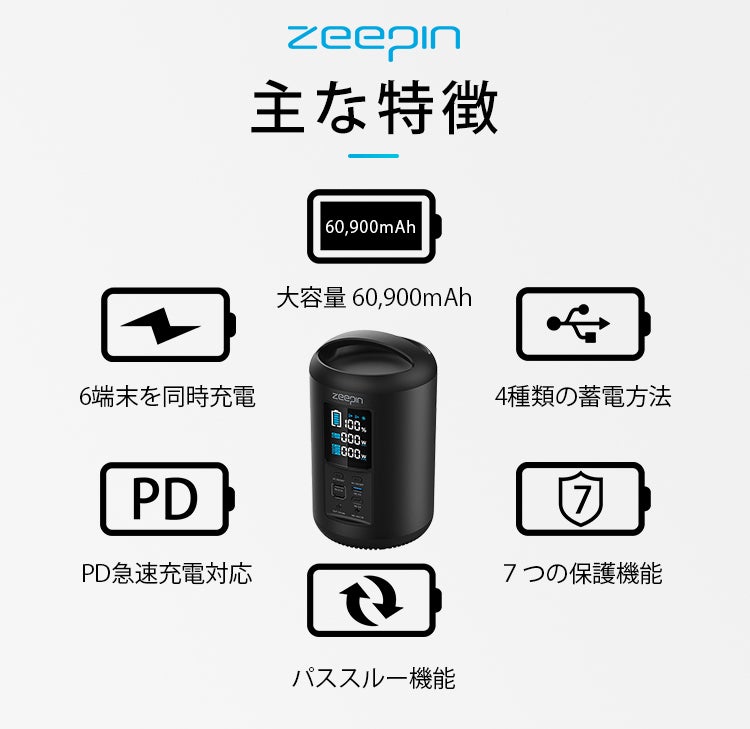 当社がお届けする「ZEEPIN ポータブル電源」は、2.5kgの軽量・コンパクトでありながら60,900mAhの大容量を実現。本体の蓄電方法はType-Cも含めて4通りご用意。使いやすさにもこだわりました。当社はコストパフォーマンスと安全性に優れた「ZEEPIN ポータブル電源」を自信を持ってお勧めします。
