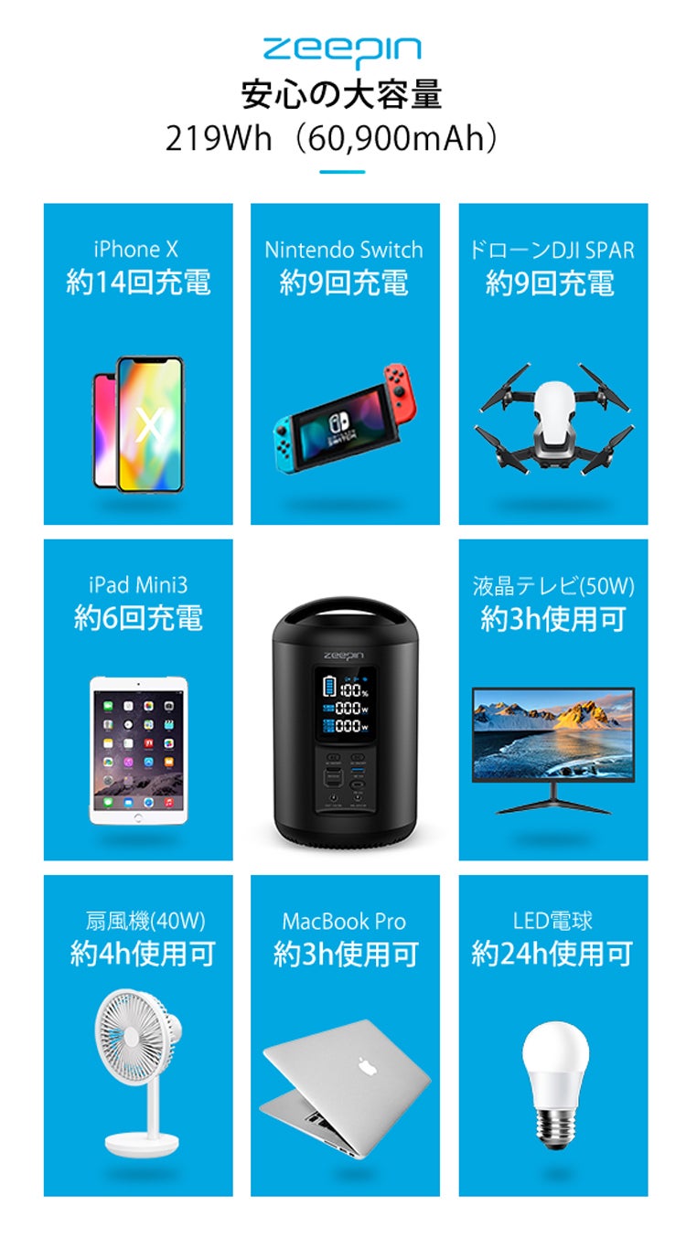 ZEEPINポータブル電源なら容量が219Wh(60,900mAh)もあり、例えばiPhone Xなら14回フル充電可能。停電時に家族全員のスマホを何度も充電できたり、キャンプなどのアウトドアで様々な電化製品に使用できます。