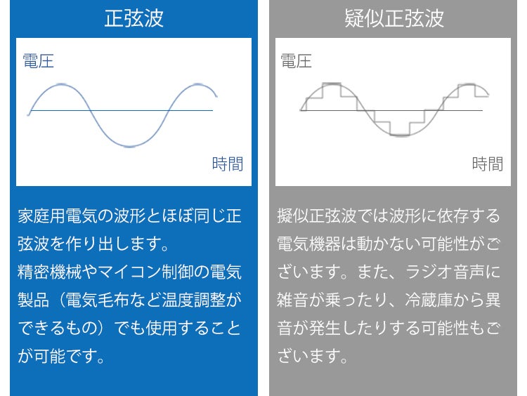 家庭用電気の波形とほぼ同じ波形の「正弦波」を作り出すため、精密機械やマイコン制御の電化製品に対応。最大消費電力が240Wもあるため、PCはもちろん炊飯器やドローン、電気ドリルなど、消費電力の高い電化製品への充給電が可能です。