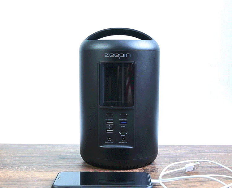 ZEEPIN ポータブル電源は丸みを帯びた円柱形、しかもブラックで落ち着きのあるシンプルなデザインです。
