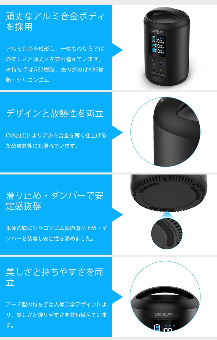 また、本体には耐衝撃性と腐食に強いアルミ合金製ボディを採用。耐久性とデザインに優れたZEEPIN ポータブル電源は、アウトドアやオフィス、野外など、あらゆるシーンにフィットします。
