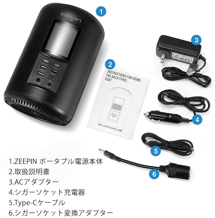 「ZEEPIN ポータブル電源」1セットには、ZEEPIN ポータブル電源本体×1、取扱説明書×1、ACアダプター×1、シガーソケット充電器×1、Type-Cケーブル×1、シガーソケット変換アダプター×1が含まれています。