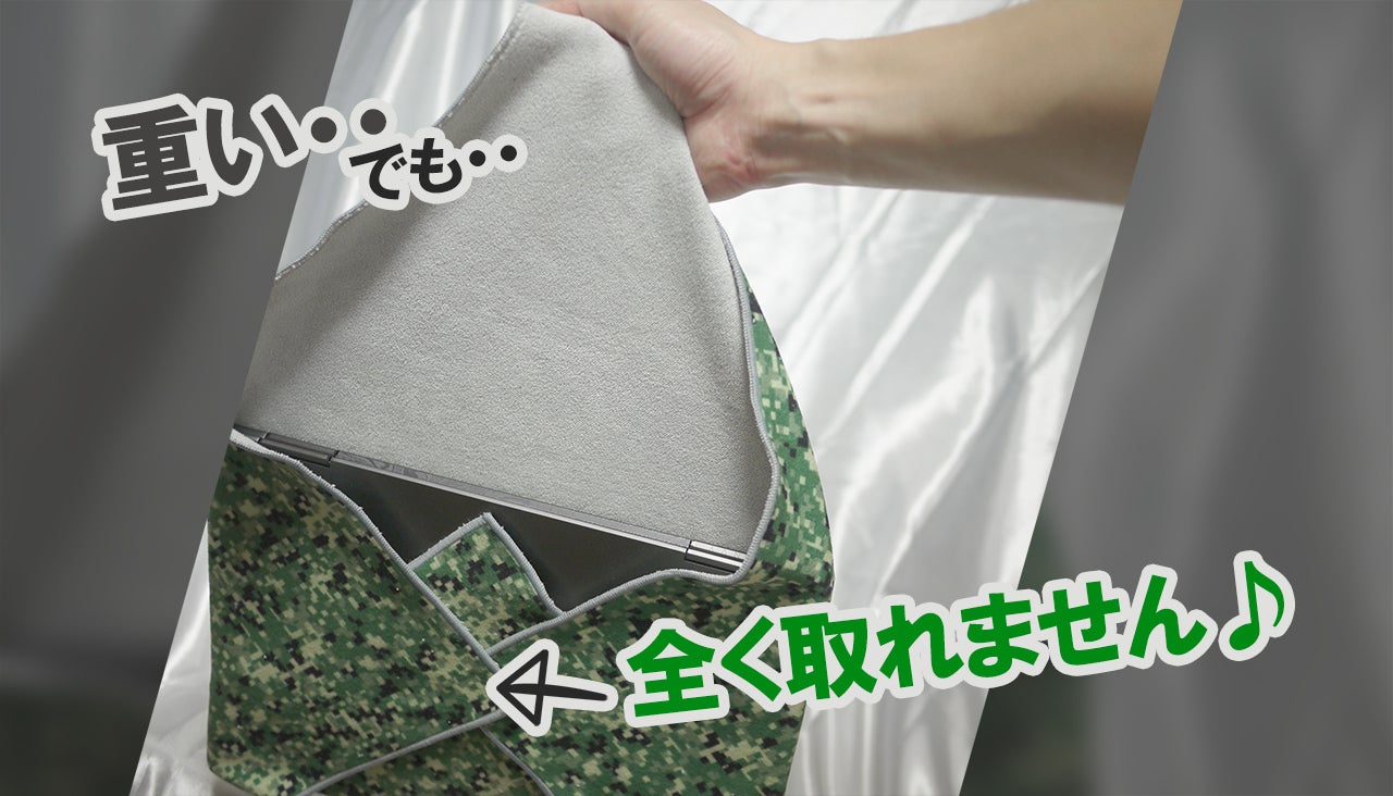 ありがたいことに、たくさんの方にご支援いただいているステキラッパー♪もちろん紹介している私も愛用しています。グリーンデジタルカモフラージュ。13インチのhpノートPCにくるっと巻いて持ち運んでいます。小型のくせにズシリとくるノートPCですが写真を見てもらうとわかるように全然落ちません。(むしろ持っている手の方がシンドイ・・・。)持てばわかる。「剥がれちゃうかも・・・」という心配は皆無!このまま上下にブンブン振っても取れないのです。愛用のマイステキラッパー♪購入してくれた皆さん、お楽しみに!
