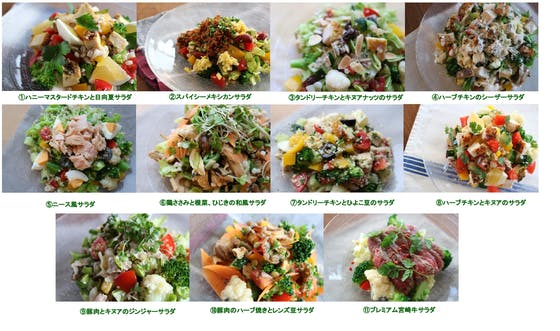 フランスで修業され、フレンチレストランのシェフも勤められた料理教室の先生、情熱ある宮崎県の農畜産のみなさん、熟練の主婦の方にもご協力をいただいて、何度でも食べたくなる「おいしさ」と緑黄色野菜とお肉がたっぷり入った「栄養満点」のサラダに仕上げていきます。色とりどりの野菜の「美しさ」は目でも楽しみながら食べることができます。また、四季折々の季節限定メニューを準備させていただきます。季節限定メニューではサラダとドレッシングに、できる限り栄養価の高い旬の食材を使います。寒い季節には温野菜のサラダなども提供させていただく予定です。