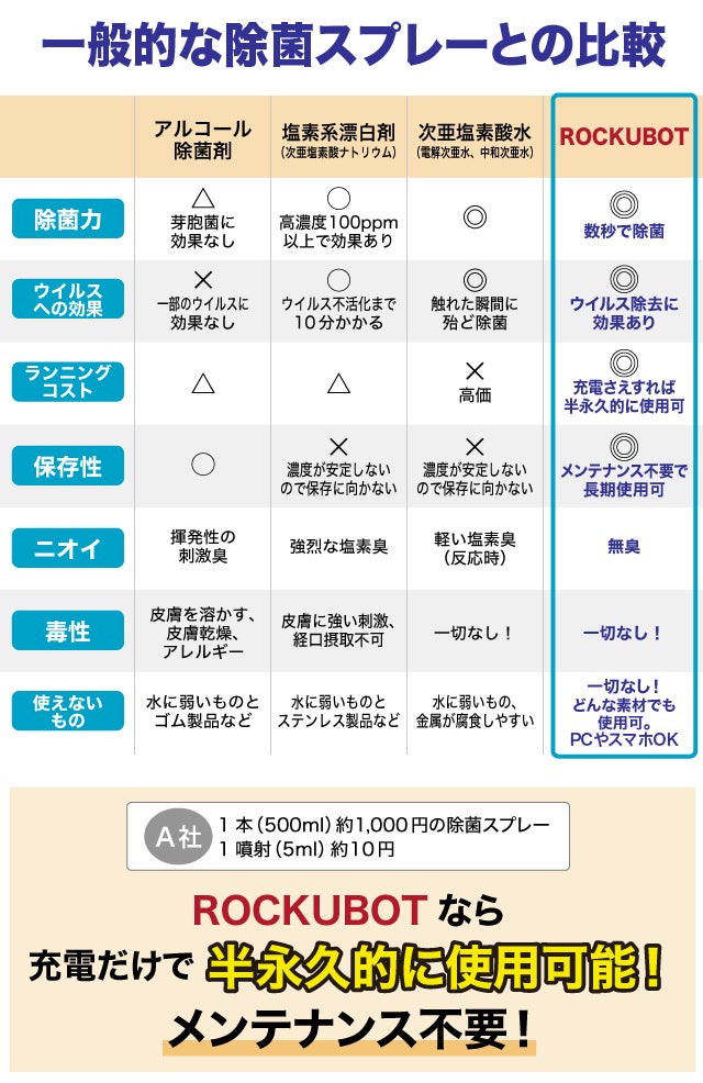 月に一回1200円のアルコール液を買ったら1か月で使い切っていた私ですが、このROCKUBOTなら充電さえすれば長く使えるし