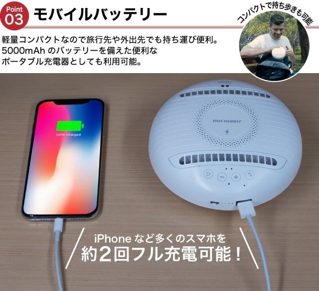 軽量コンパクトなので旅行先や外出先でも持ち運び便利。5000mAhのバッテリーを備えた便利なポータブル充電器としても利用可能。