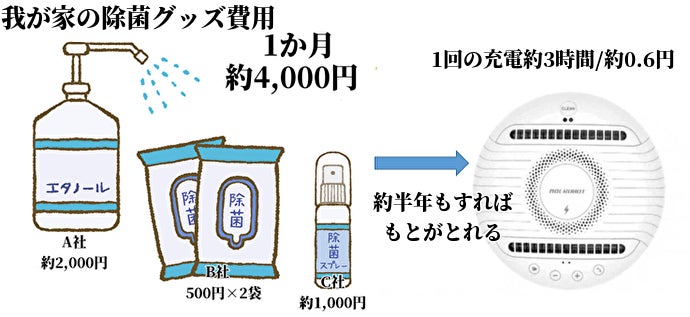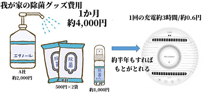 除菌ウェットティッシュや携帯用の除菌スプレーなど他にもいろいろ除菌グッズを買っていて、全部合わせた金額はだいたい月に約4000円ほど・・・・