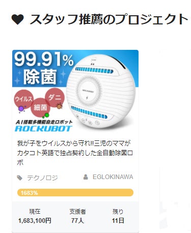 「スタッフ推薦のプロジェクト」としてトップに掲載頂いていることも大変うれしく思います。