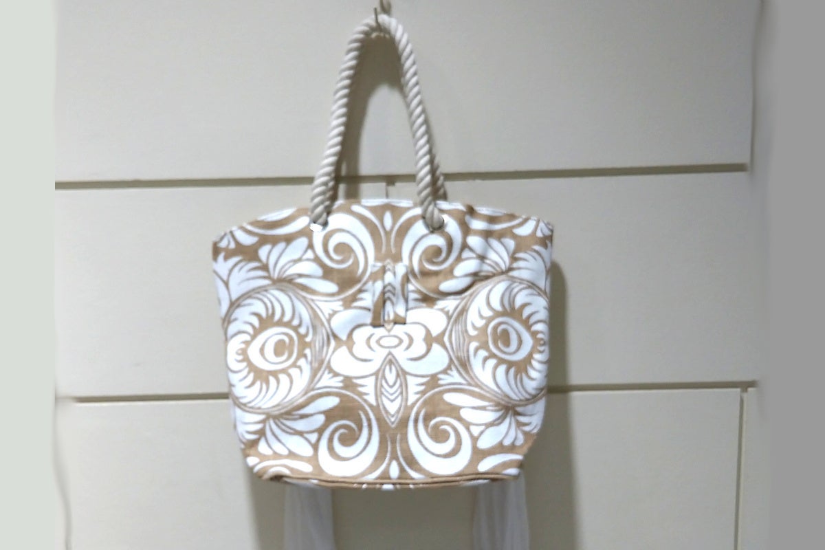 バッグの口はファスナー仕様でしっかり閉まります。持ち手は綿100%の生成ロープを使用しています。