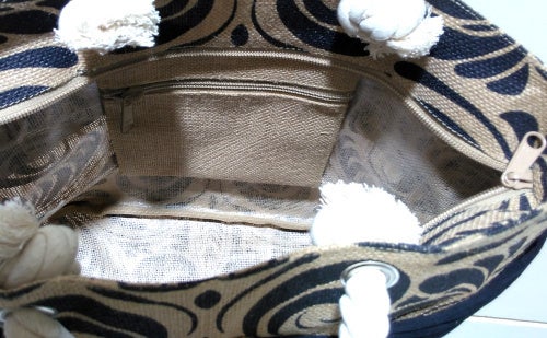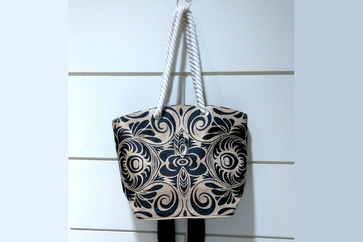 近年注目のエコ素材「ジュート(黄麻)」を使用しました。ブリント柄は取り都合により一点一点若干の違いが発生します。