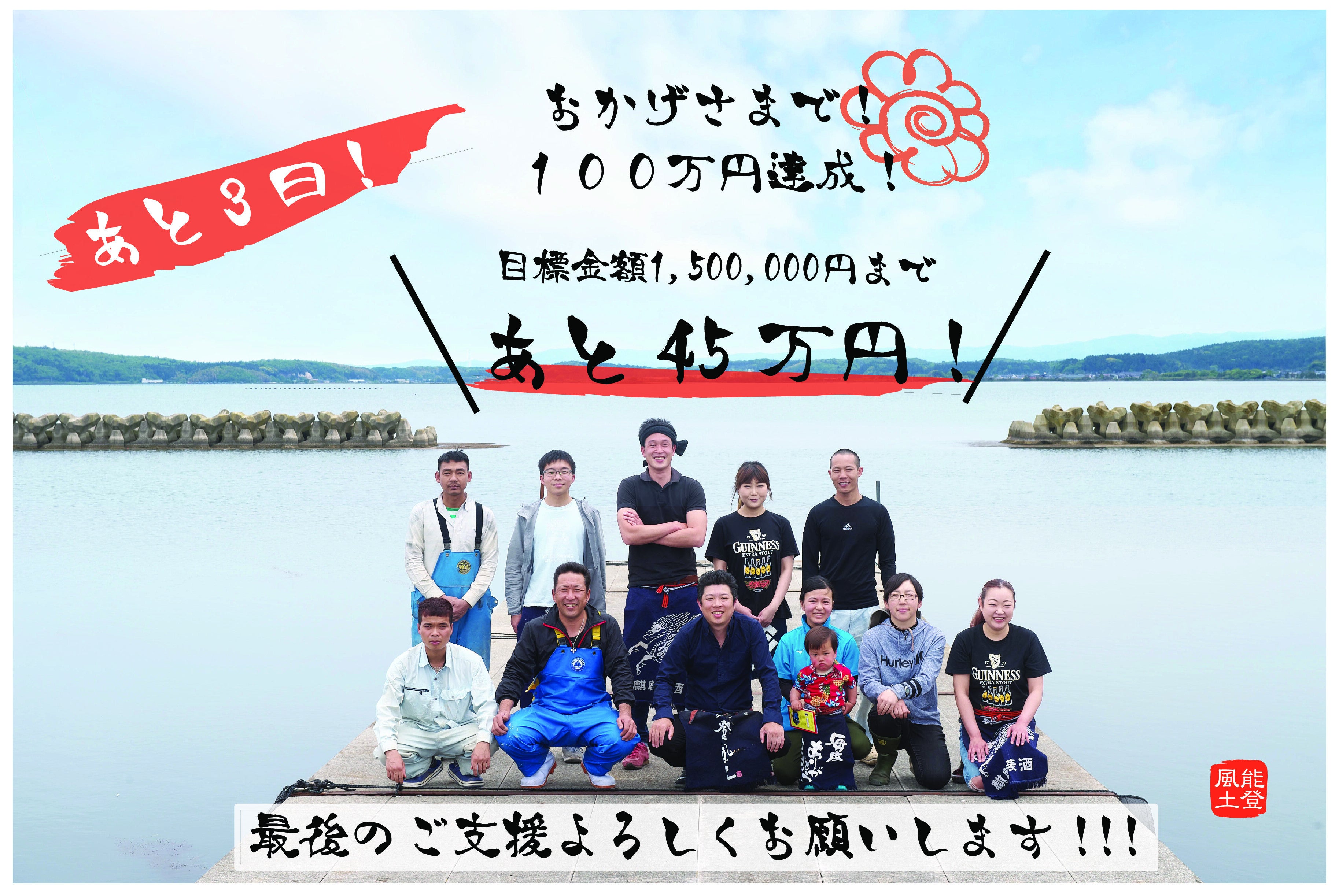 2020/05/15 21:17「#コロナに負けない!美味しい能登かきを届けたい!」新型コロナウイルスの影響で、行き場を失った『能登かき』を全国の皆様にひとつでも多くお届けするために企画したクラウドファンディング。1か月間の挑戦もついに残り3日となりました!既に多くのご支援を頂いておりますが残り3日にして目標達成へのゴールが見えてきました。ー現状報告(27日目) 5月15日(金)19時現在ー目標金額1,500,000円支援者数136人総支援額1,068,500円 (達成率71%)71%目標金額まで残り431,500円またSNSなどシェアで応援してくださっている方々のお陰様でFacebookでのシェアは、1,729件にのぼっています。ご支援とともに、温かいメッセージもたくさんいただいており、とても励まされると同時に身の引き締まる思いです。目標金額である150万円を達成し、このチャレンジを成功させることが、同じような境遇にある生産者の新たなチャレンジを生み出すきっかけになるのではないかと私たちは考えています。重ねてのお願いで大変恐縮なのですが最後に皆様の力を貸してください!最後の3日間でもっと多くの方々にこのプロジェクトを知ってもらうために友人やお知り合いにSNS等で情報を広げて頂けると大変嬉しいです。皆さんの期待に応えられるよう、最後まで全力を尽くして取り組んで参りますので今後ともご協力のほど、よろしくお願いいたします! もっと見る