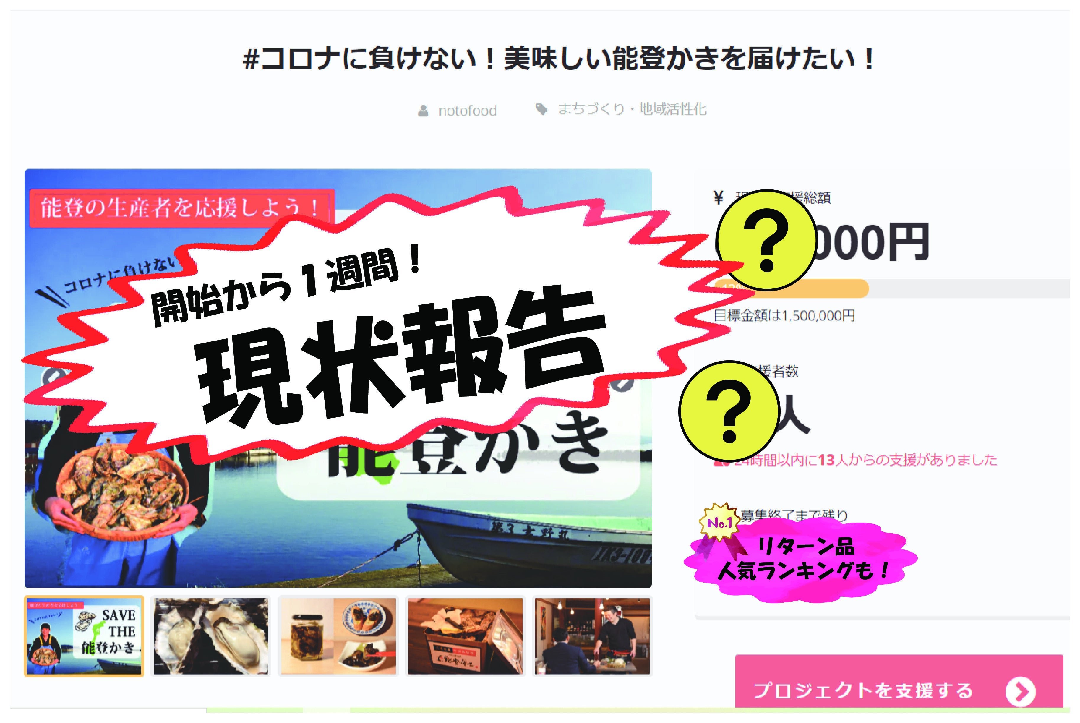 「#コロナに負けない!美味しい能登かきを届けたい!」のクラウドファンディングを開始してから、1週間が経ちました。新型コロナウイルスの影響で、行き場を失ったたくさんの能登かきをひとつでも多く、皆様に食べていただきたいとの想いで立ち上げたクラウドファンディング。開始から1週間の現状報告をしたいと思います!達成率は現在42%!4月26日(日)午前10時現在・支援総額 636,000円・支援者数 80人プロジェクト終了まで残り22日で、目標金額までは残り864,000円です!Facebookでのシェアは、1,081件にのぼっています。ご支援いただいた80名の方、SNSなどでシェアして応援してくれている方、本当にありがとうございます!!!目標金額まではまだ半分以上あるので、まだまだがんばります!リターン品人気ランキング!現在のリターン品の人気ランキングをまとめてみました。・1位 「牡蠣のコンフィ2個」 5,000円 《31個》・2位 「能登かき半斗缶」 8,000円 《28個》・3位 「牡蠣のコンフィ2個&能登ワイン」 10,000円 《12個》・4位 「牡蠣のコンフィ1個」 3,000円 《8個》・5位 「浜焼き能登風土ペアお食事券」 10,000円 《7個》となっております!ご支援とともに、温かいメッセージもたくさんいただいており、とても励まされています。本当にありがとうございます!!! 引き続き、ご支援ご協力よろしくお願いします!