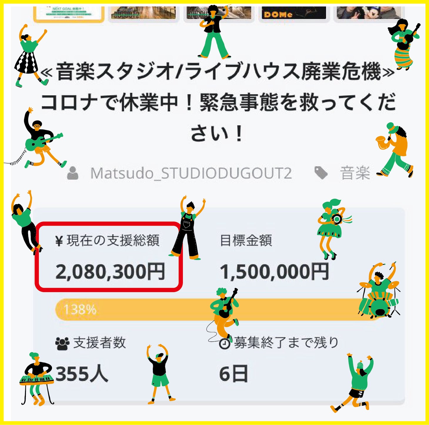 しかしながら、緊急事態宣言期間延長が囁かれる中、未だDOMe柏だけでなく音楽スタジオ「松戸スタジオダグアウト2」も、通常営業に戻れる見込みすら立てられる状況ではないのが現実です。エンターテイメント業界だけに限った話ではないことは重々承知の上ではございますが、目を瞑りたくなるような厳しい状況はクラウドファンディング終了以降もまだまだ長く続くと思われます。ですが、残念ながらクラウドファンディングの期間延長はできません。