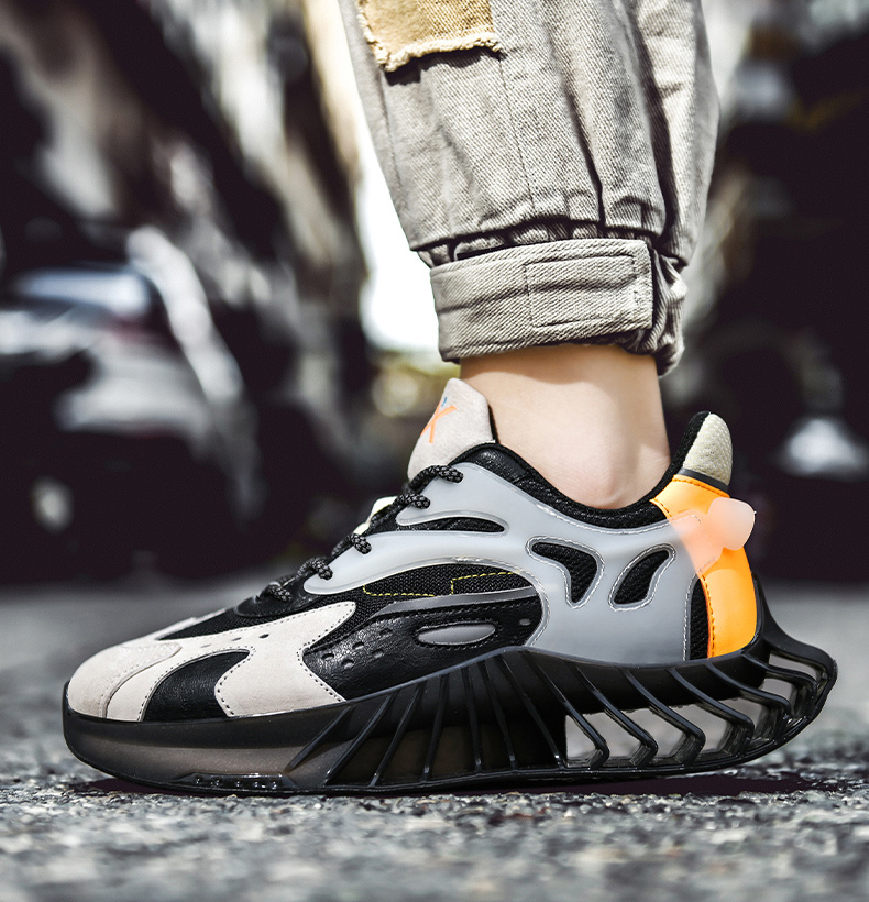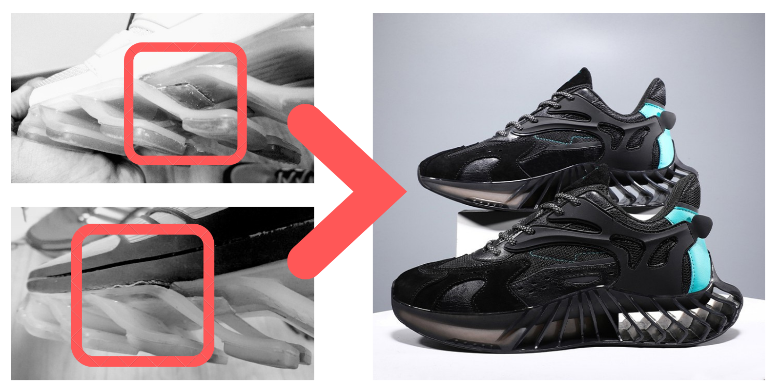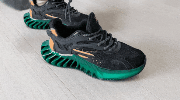 ブレードスニーカーは、パラリンピックのランニング競技で選手が使用する義足の形を取り入れ誕生しました。ソール一面に配置された“J型ブレード"がバネの役割を果たし、着地時の衝撃を吸収し、膝への負担を減らしてくれます。また足への衝撃を推進力に変換し、歩行、ランニング、跳躍をサポートする役割を果たしてくれます。しかし、ソールのブレードが折れやすく、汚れを落とすのが大変など課題が残されていました。