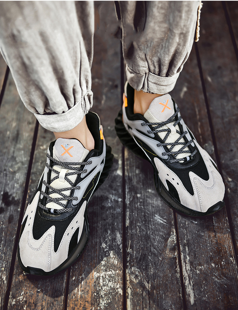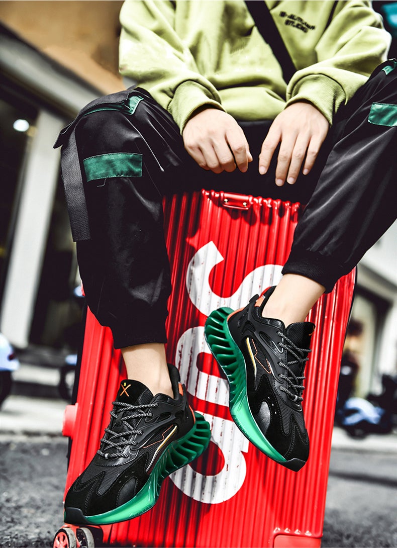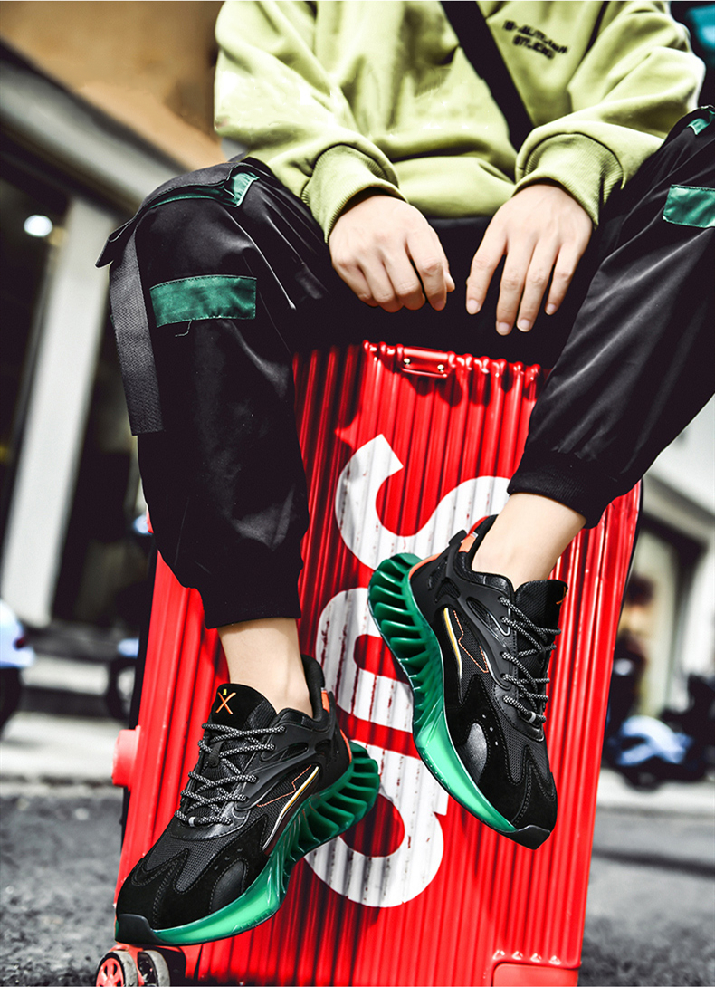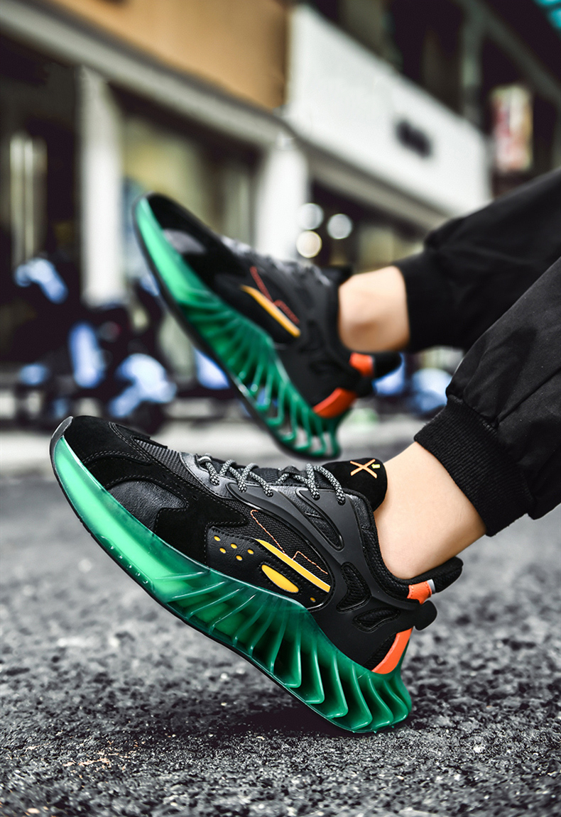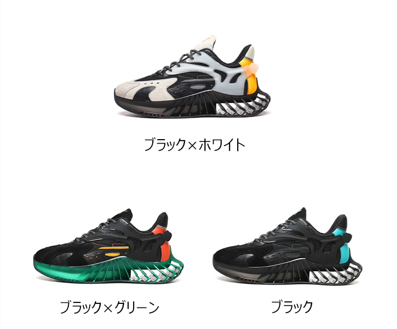 ■ソール:人間工学に即した立体網目構造で着地時の衝撃を吸収し、膝への負担を減らしてくれます。厚手TPU+ETPU素材を使用することで、従来のブレードソールより耐久性が一段と上がりました。また、一面続きの為、お手入れもしやすいです。