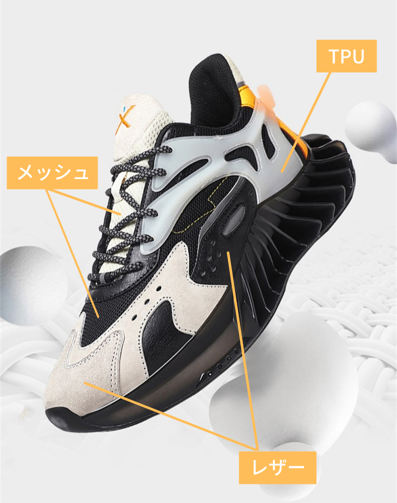 ■アッパー:メッシュ素材で通気性を保ちつつホールド力を強化し、動きやすさを実現。また衝撃を受けやすい部位にレザーで補強することで、足の保護およびアッパーの耐久性を向上させました。