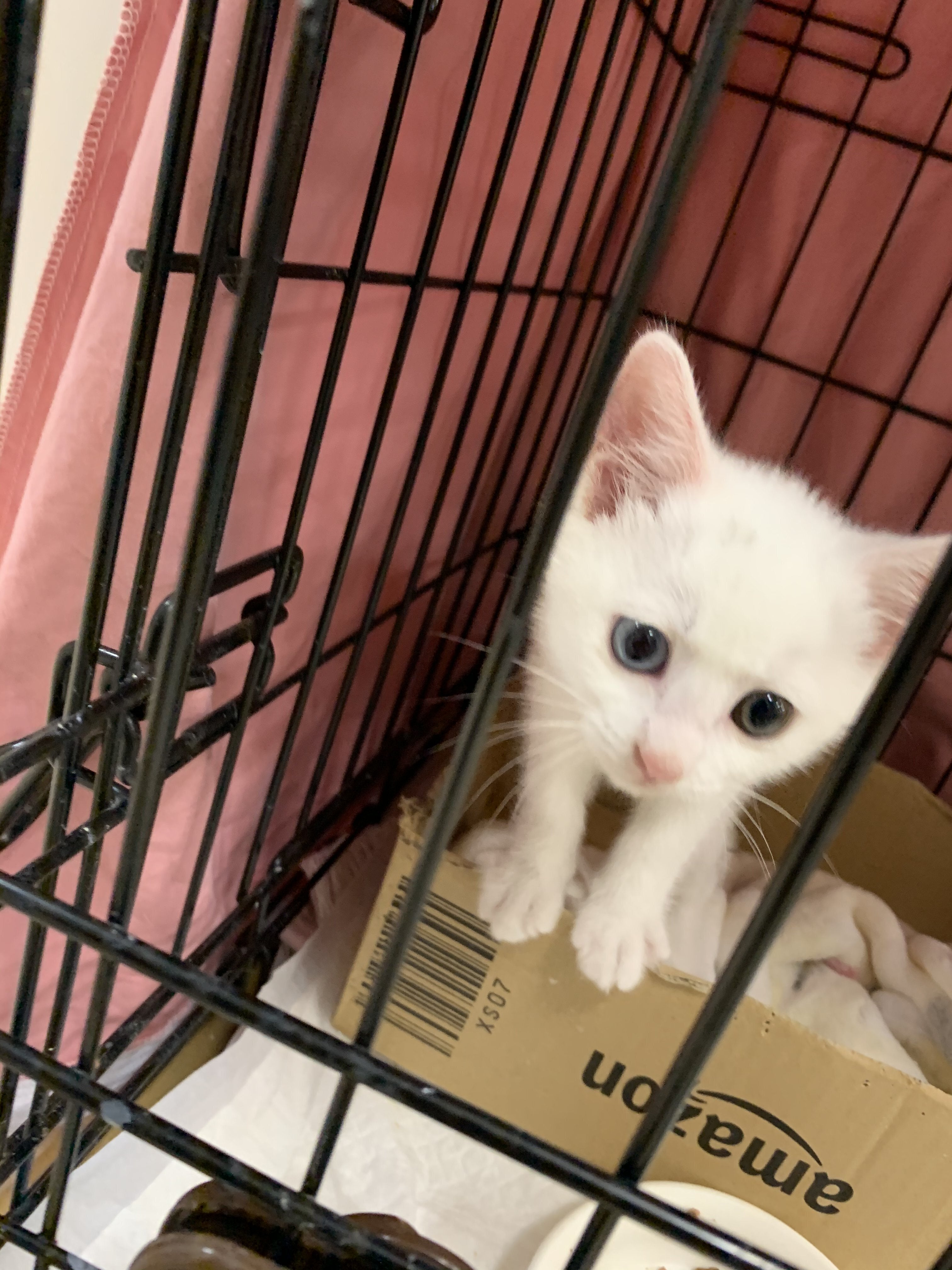 生後2ヵ月ぐらいの白猫 つつじちゃんも、そんな緊急入店組のひとり。