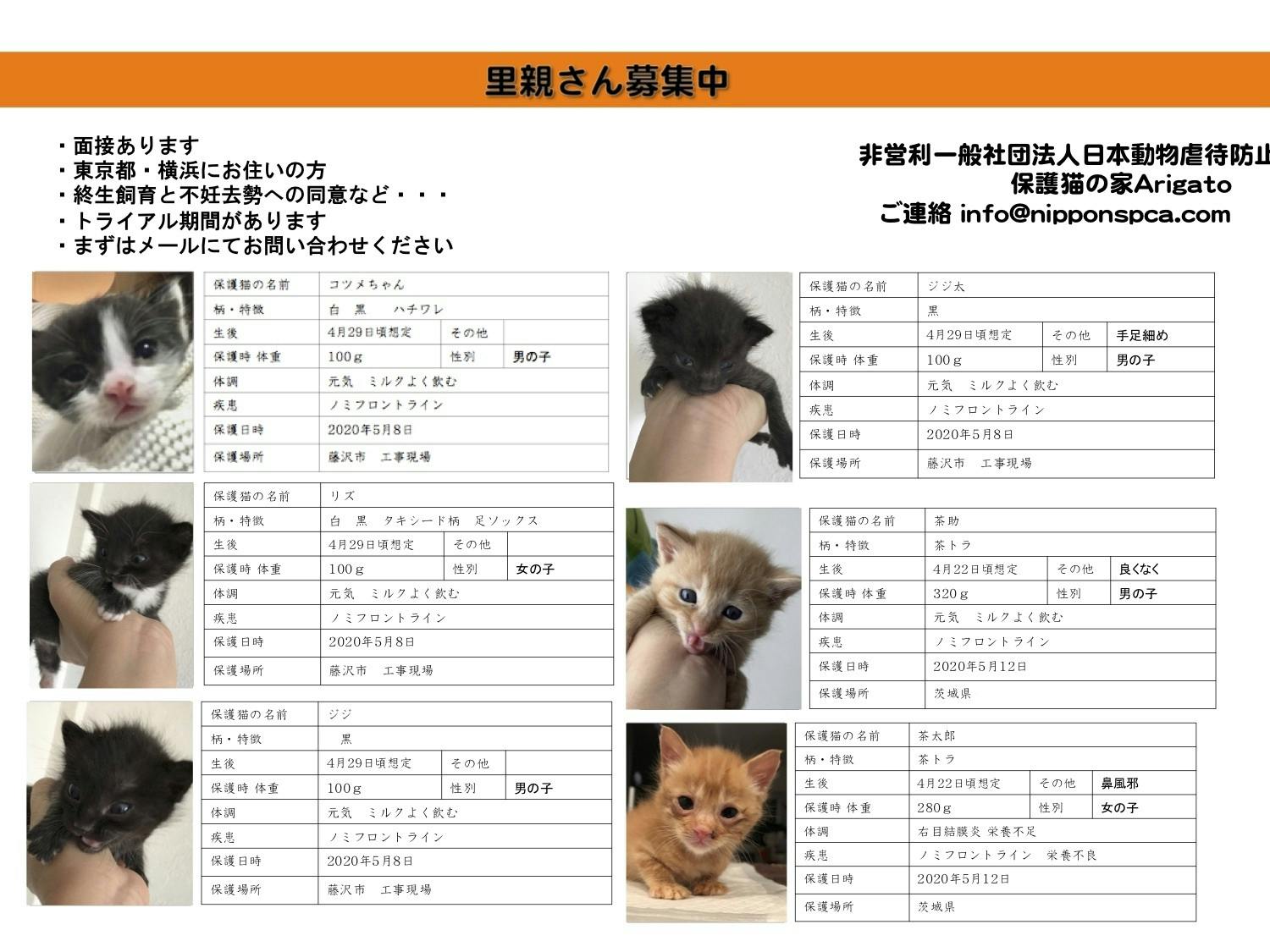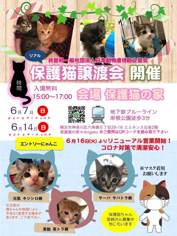 2020/06/02 15:06皆様のご支援のおかげで保護猫譲渡会を開催予定することができました。ありがとうございます!子猫相談も増えてきました。引き続きご支援いただける方はこちらからお願いします子猫達も治療をたくさん頑張ってくれました。幸せ猫になる為にスタッフ共々、より良いご家庭に送れるようにリアルで譲渡会を開催致します。コロナ対策を行い*今月6月7日(日曜)14日(日曜)リアル譲渡会を保護猫の家*Arigatoで開催します。*時間 15:00〜17:00 2時間だけになります。*来場無料 マスク着用をお願いします。*アルコール 空気除菌設置ペットショップではなく保護猫を家族として考えてくれる方一生大事に考えてくれる方終生飼育を徹底するために面談・審査 家庭訪問 契約書がございます。予めご了承下さい。シェアいただけたら幸いです。スタッフ一同頑張ります!【募集中】ボランティアスタッフ募集中履歴書をinfo@nipponspca.com までお送りください。 もっと見る
