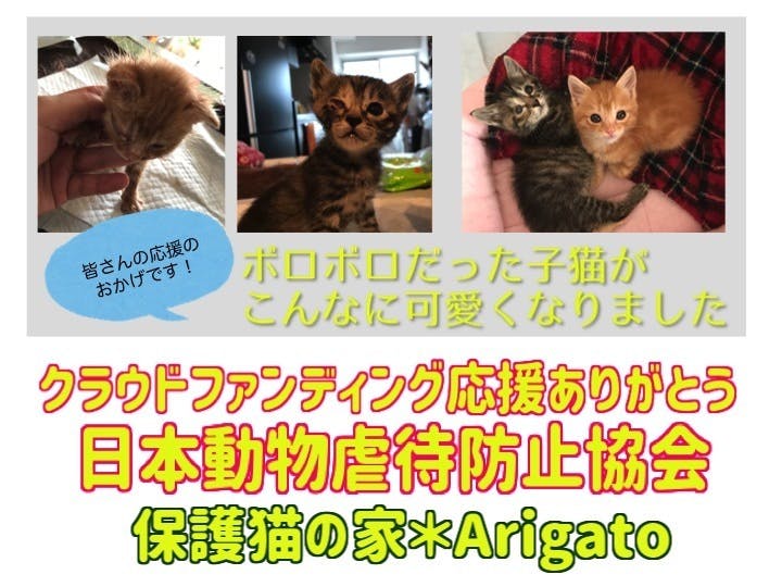 2020/05/28 19:52ご支援いただいた皆様!ツイッターで鬼リツしてくれた皆様!心から感謝申し上げます。なんとか保護猫の家を6月から再オープンさせることができそうです。ただ、オープンさせるだけでなのではなく、アフターコロナで皆さんが安心して楽しめるよう、システムや、室内など改装が必要であり、現在リニューアルオープンに向けて頑張っています。6月13日を目処に通常営業できるように準備を進めております。先日、保護した子猫ですが、残念ながら助けられませんでした。。。嘔吐が続き衰弱が激しく自分の無力さをただ、思い知らせれました。。マロンと名付けました。マロンちゃん助けられずに本当にごめんなさい。 兄弟で来た2匹でした。同じ症状で嘔吐、下痢、脱腸などがありました。もう1匹の猫ちゃんは元気になって欲しいと「元気」と名付けました。元気は徐々に回復し、すっかりとその名の通り元気になりましたが深夜に救急病院に行ったり、猫専門の動物病院に通うなどして一時は回復の兆しもあったのですが、急激に衰弱し昨日に亡くなってしまいました。応援してくれた皆様ごめんなさい。。。助けられなかった子猫には、本当に申し訳ない思いです。皆さんもせっかく、子猫たちが元気に里親に行くように願って応援してくれたのにこんな悲しい結果になってしまい、ただただ、自分を責めるしかありません。なので、報告の言葉も見つからず今の配信となってしまいました。ごめんなさい。ごめんなさい。ごめんなさい。亡くなったマロンの分まで他の子猫ちゃんを幸せにできるよう、努力していくしかないです。今以上に、努力して、やれることをやって、マロンちゃんの死に報いたいと思います。至らない私をお許しください。今後も精進して参ります。応援メッセージを一言一言大事に読まさせていただいております。ありがとうございます。日本動物虐待防止協会代表理事 藤村晃子 もっと見る