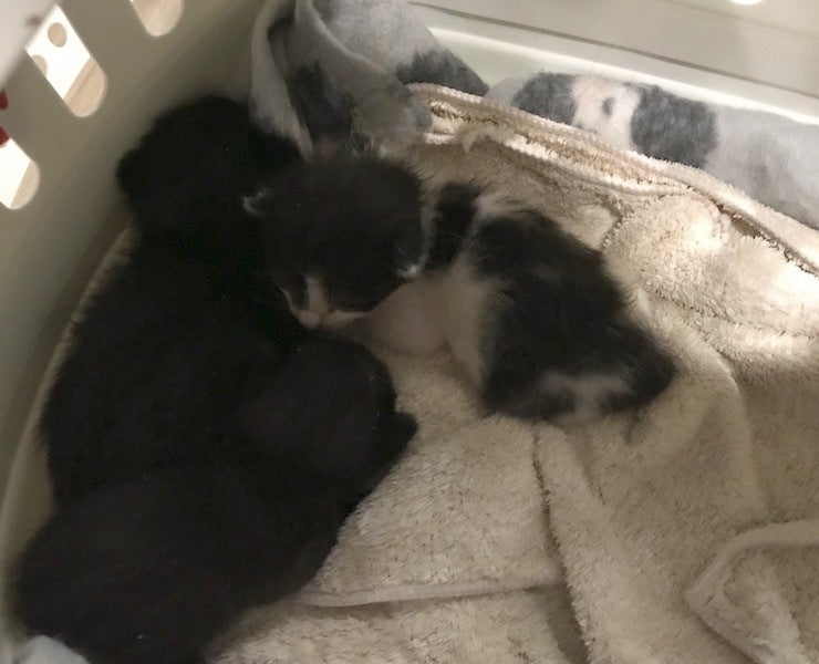 資材置き場に身を寄せ合いカラスに狙われていたところを