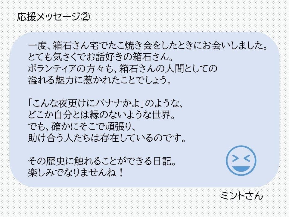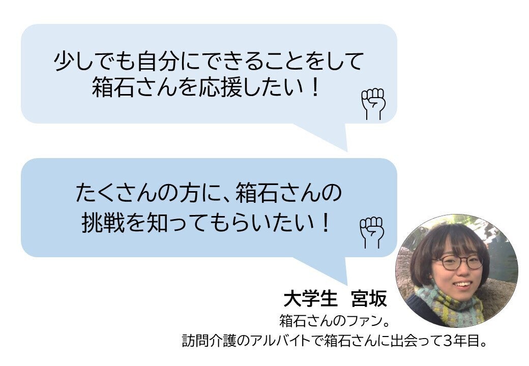 箱石さんの思いや、ボランティアさんたちとの「笑いあり涙あり」の生活の1ページをお届けしたいです。応援よろしくお願いします!
