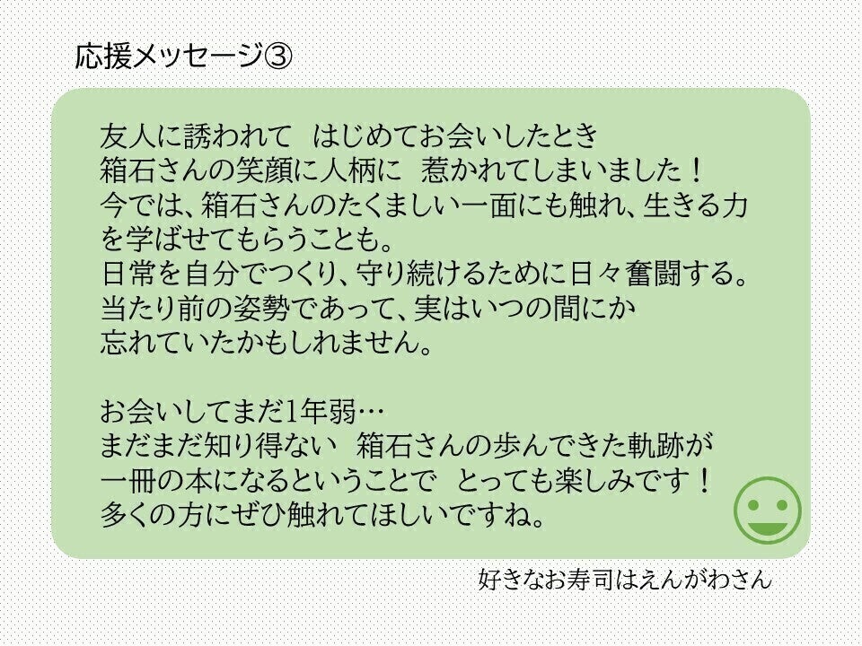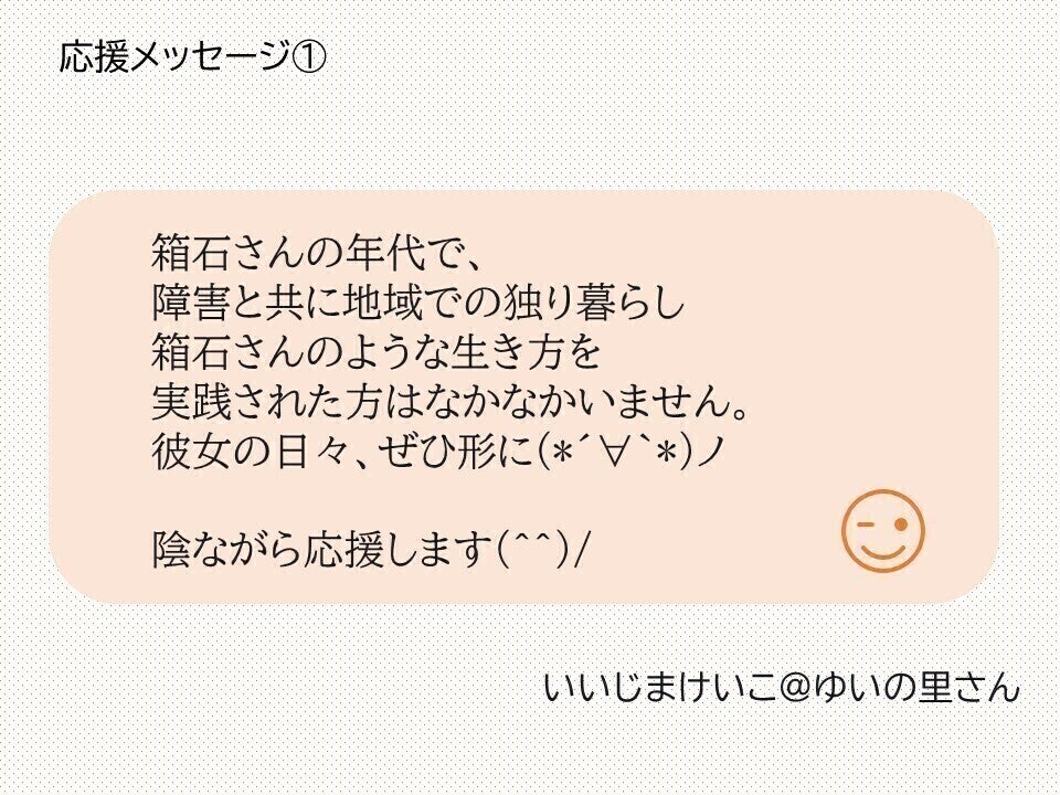 箱石さんが送ってきた、某「こんな夜更けに〇〇かよ」のような、自立生活の半生をみなさんに知ってもらいたいです。