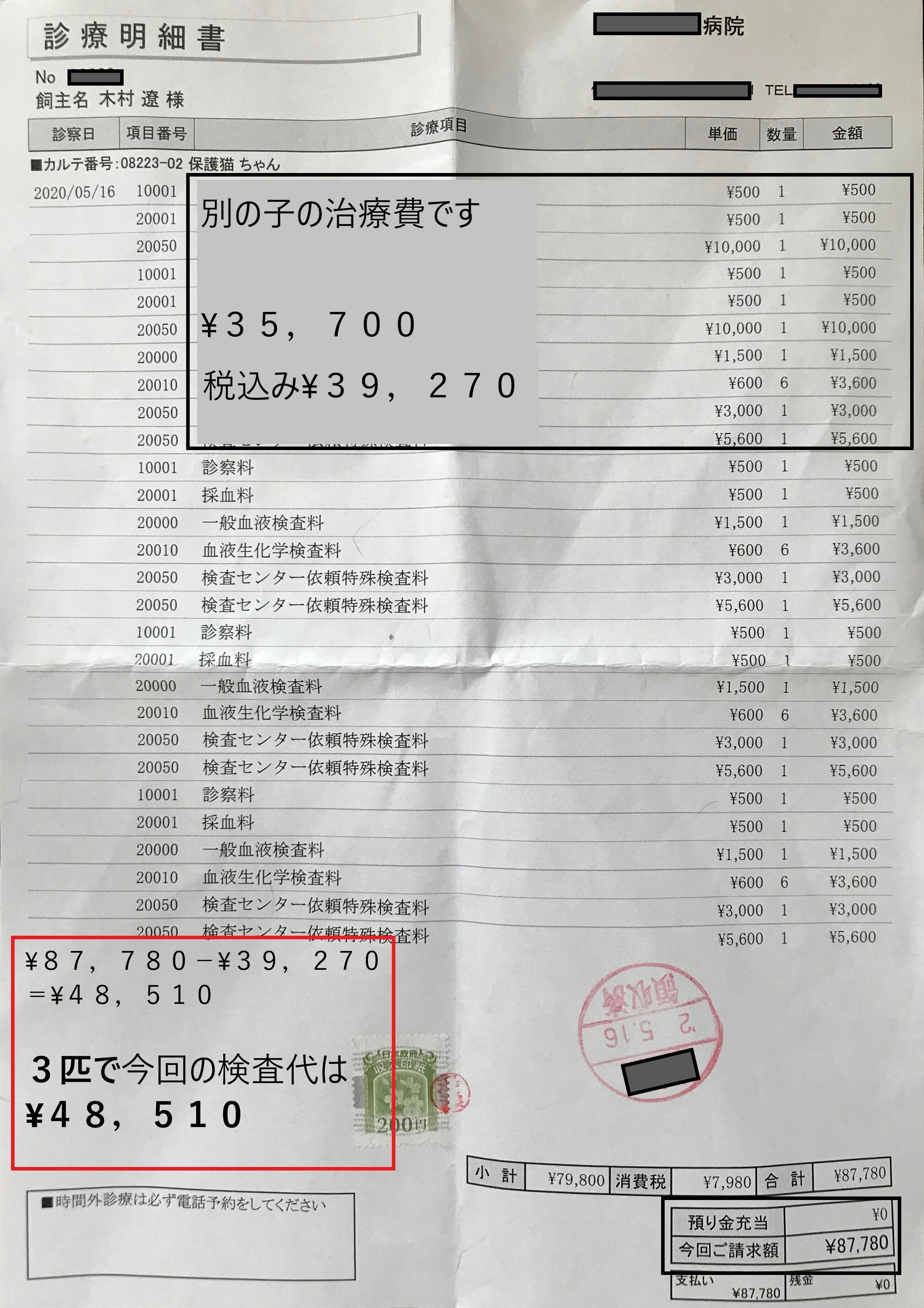 ※この明細にはFIP治療を終えた2匹の診察が混ざっているので、修正しております。