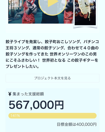 2017/05/10 13:47パトロンの皆様 ご支援ありがとうございました! お陰様で! 見事 140パーセントを 上回る達成となりました! 12日 に いよいよ ギターを 取りに行ってまいります。 ただ 支援金が 振り込まれるのが 来月末とゆうことで、、 とりあえず 35マンを 仲間からかき集めて 宇都宮にいってきます! とほほほほ、、、 超過金額では 餃子BANDの 大切曲。 涙の肉汁の MVを 撮らせてもらいます! つきましては その MVの エンドロールに ご支援くださった皆様の お名前を刻みたいと思っております。 もちろん任意でございますが、、 その際の 名義を どうされるか, 後ほど 皆様に メールさせていただきます。 クラウドファンディング終了後に 皆様の連絡先や ご住所が こちらの方に降りてくる ことになっているのですが、、 まだ その辺の連絡がきません、、 もしかしたら その後の郵送で 餃子ライブのチケットなどを発送するつもりでおりましたので どうなることやら、、 最悪郵送で まにあいそうにない場合は、、 5月14日 の 新宿アンチノック 受付にて ご支援者様 に 行き届くように 手はずを組んでおきます。 それ以外のリターンについても随時連絡させていただきます! こちらは 昨夜お送りいたしました。 感謝のツイキャス放送です。 餃子ソングたくさん 歌わせてもらいました! http://ja.twitcasting.tv/isaviewtiful/movie/371108604 もっと見る続くご支援 ありがとうございます!