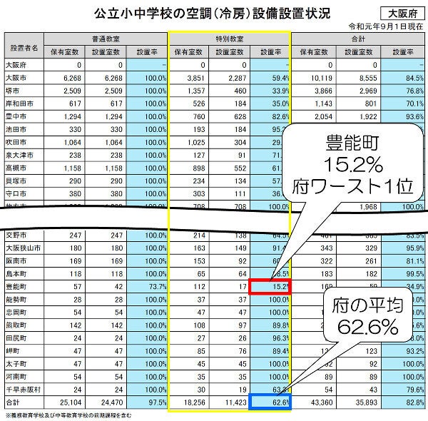 2019年9月1日文科省発表の資料によると、大阪府の小中学校「特別教室」へのエアコン設置率は平均で62.6%。ところが、豊能町は大阪府でワースト1位の15.2%でした。