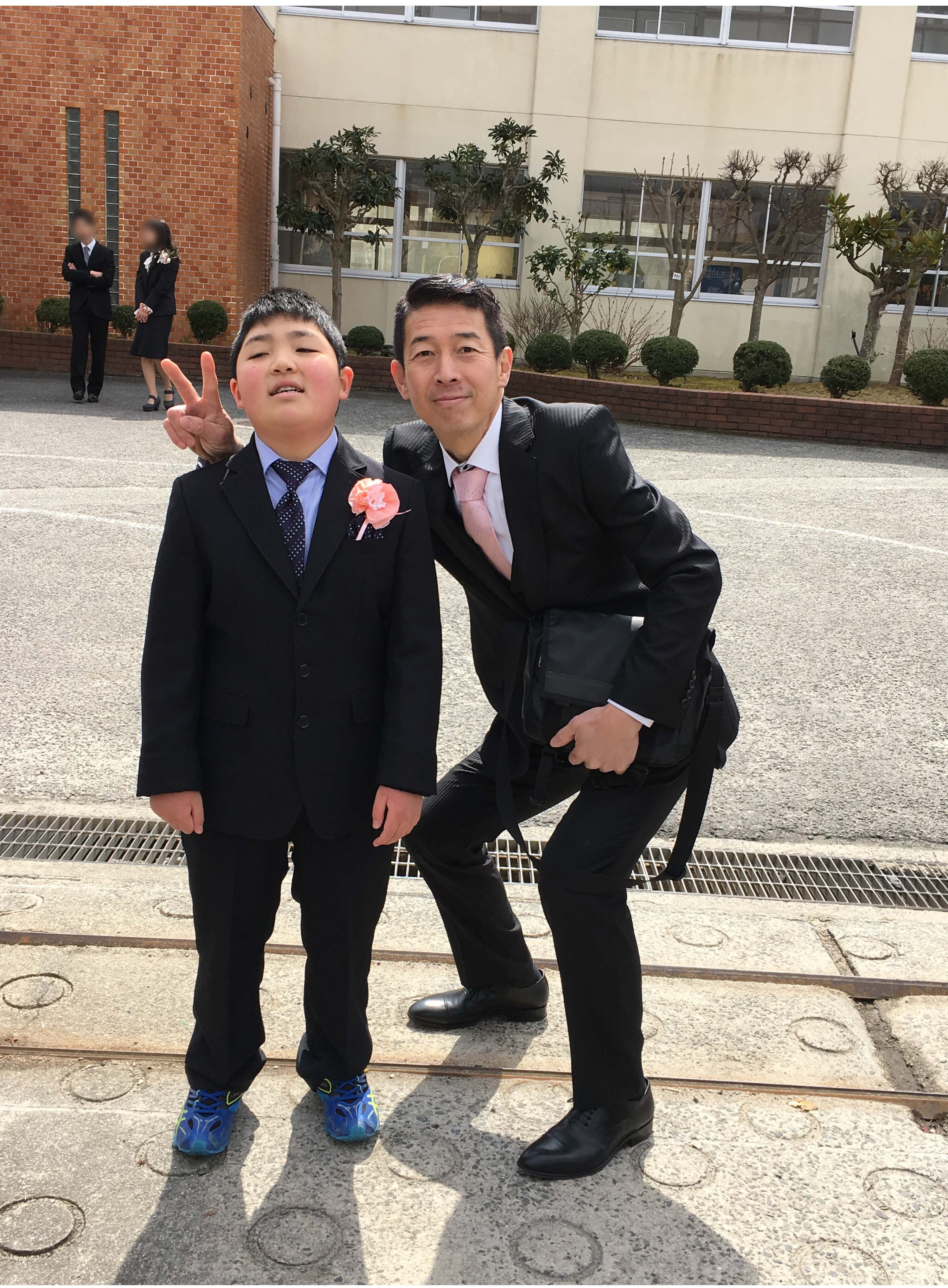 副会長 萬本三二六(まんもと みつる)です。左は次男。東ときわ台小学校の卒業式にて。