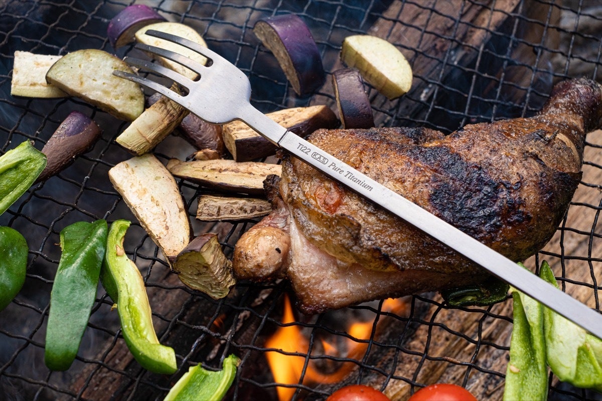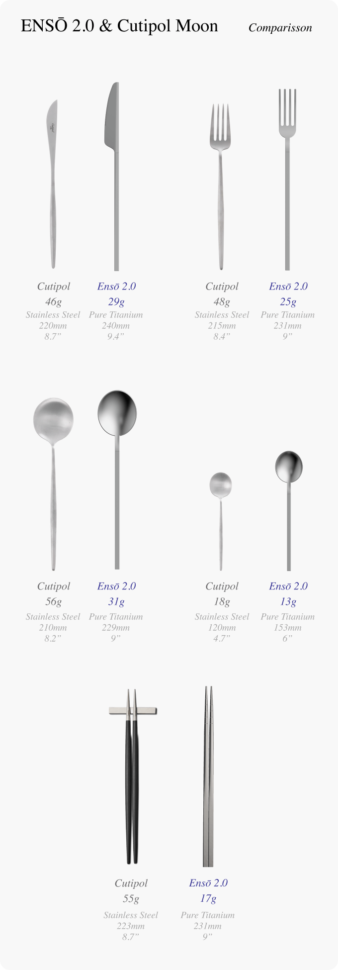 下の画像でわかるように、ステンレス製のカトラリー(左)と重量を比較すると、純チタン製の「Ensō 2.0」(右)の方がはるかに軽いことがわかります。