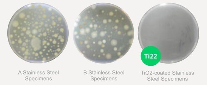 以下は、ペトリ皿に一般的なステンレス鋼標本2種類(AとB)とチタニア(TiO2)をコーティングしたステンレス鋼標本を置いて24時間経過した時点での黄色ブドウ球菌と大腸菌コロニーの繁殖状態を示しています。チタンの抗菌力の強さは一目瞭然です。