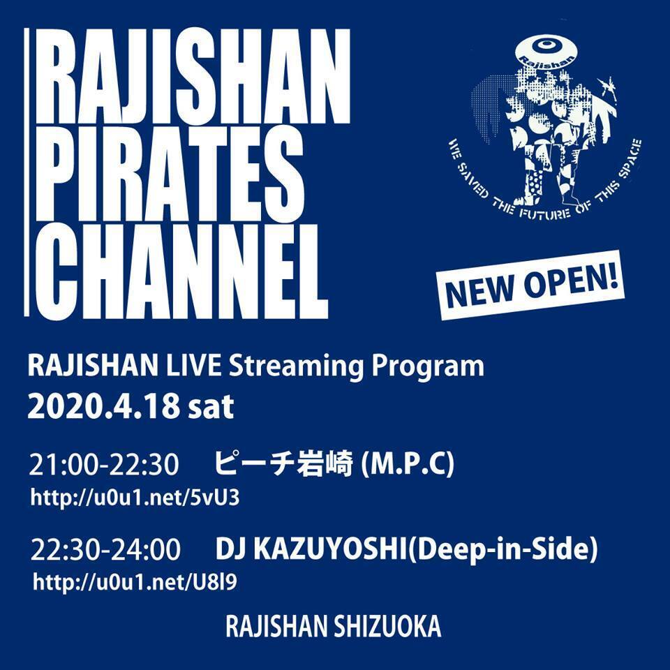 皆様重ね重ねこの度はご支援賜り本当にありがとうございました。ラジシャンは営業停止から3週間以上が経ち、この休業中何かを発信出来ないか考えておりました。そこで今晩4/18土曜の21時からDJ Kazuyoshiとピーチ岩崎によるライブ配信を実施します。ピーチ岩崎は静岡県焼津市の自宅スタジオから、DJ Kazuyoshiはラジシャン店舗からの2元中継となります。なにしろ初めての試みで試行錯誤しながらの為、至らない点や反省点も確実に出てくるだろうと思いますが回数を重ねてより良いカタチにしていければと思っております。お時間御座いましたらご視聴いただければ幸いです。よろしくお願いいたします。RAJISHAN LIVE Streaming Program2020.4.18 sat★21:00-22:30 ピーチ岩崎(M.P.C)http://u0u1.net/5vU3★22:30-24:00 DJ KAZUYOSHI(Deep-in-Side)http://u0u1.net/U8l9