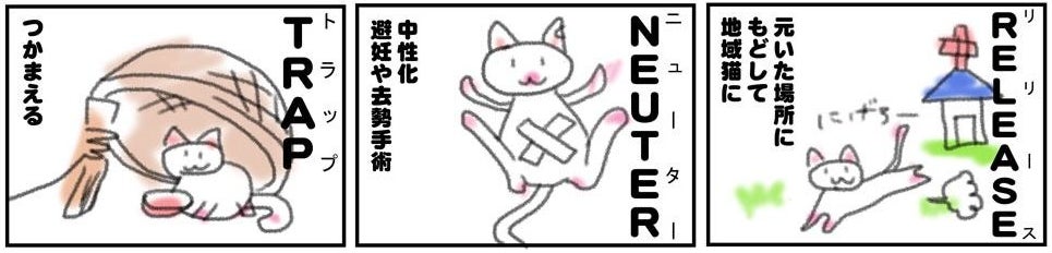 私共の活動のもう一つの柱が、野良猫を避妊・去勢して地域猫にするTNR(Trap、Neuter、Release)活動です。猫は人間が飼育・繁殖させたことで日本に定着した動物であり、本来は人間の庇護の下で生きていくことが望ましいのです。 しかし、飼養できる猫の数には限度があり、全ての猫を保護することはできません。苦渋の決断として、今いる猫を不妊化により地域猫とすることで一代限りの生を全うさせることで野良猫の数を減らすべく、取り組んでおります。