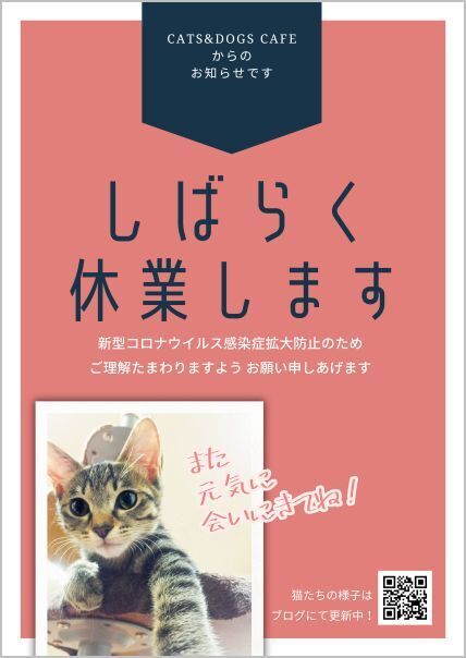 このたびの新型コロナウィルス感染拡大防止のため、No!3密(密集、密接、密閉)が言われております。しかし、当店の猫ルームはそれほど広いスペースではないため、営業を継続した場合、ご来店いただくお客様に感染のリスクを負わせることになってしまいます。当店からのクラスター発生の可能性、万一にも当店スタッフに感染・隔離が発生した場合に猫の世話ができなくなるリスクは看過できないと考え、4月1日より当面の間、休業を決断いたしました。
