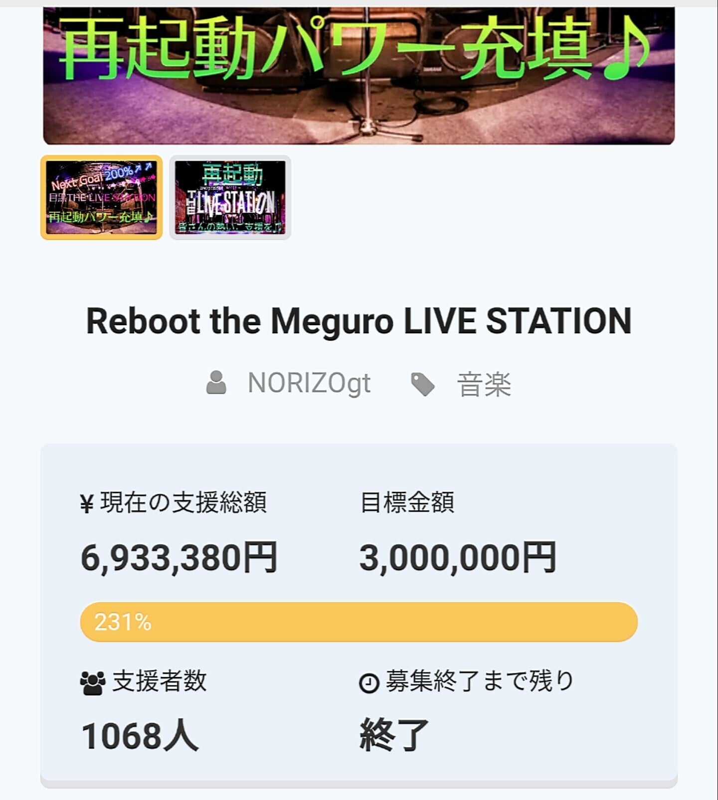 目黒ライブステーション再起動プロジェクト"Reboot the Meguro LIVE STATION"圧倒的大勢様の熱いご支援により、6月9日(ロックの日)終日を持ちまして募集期間を終える事ができました。プロジェクトメンバーはライブステーション代表取締役・松谷さん同じくライブステーション・チーフ稲田さんイベンターKyo-chanギタリストHideさんそしてわたくしギタリストNorizo。プロジェクトメンバー一同より心から感謝の気持ちをお伝えしたいと思います。誠に誠にありがとうございました。6月9日最終日も昼夜問わず常に止まることなくご支援発生の通知メールがわたくしのスマホに届いておりました。この文面を作成している間も続々と通知が来ています。これはプロジェクト公開初日からずっとです。毎日一日も欠かさずです。そして追加リターン発表後はさらに加速し、終盤になるほど増えてくるんです。私は普段からスマホはバイブ設定にして身につけています。極力仕事中も身につけています。この50日余りの間、食事をしているとき、仕事をしているとき、街を歩いているとき、いつ何をしているときもその「ブッブッ!!」という通知が来るたびに皆様のお気持ちを感じ、その責任も忘れることなく過ごしてまいりました。これからはメール通知を感じることはなくなりますが、この一ヶ月半はわたくしにとって一生涯忘れることのない貴重な経験となりました。今後はご支援者様へのお礼メッセージ作成とリターン制作に取り掛かってまいります。4月18日時点での初期目標額300万円をたったの3日間である4月21日に達成し、追加リターンを公開する5月22日まで毎日右肩上がりで478万円にまで到達。追加リターンを公開後も合わせますと、1068回に及ぶ支援は231%にあたる693万3380円となりました。ほぼ700万円です!!語気を強めて申し上げますが、これは本当に本当に凄すぎることです。皆様ステキ過ぎます!!やはりライブステーションで演奏をした経験のある日本全国の40〜50代の方から多くの支援が集まりました。リターンは女性に喜ばれるものを、とKyo-chanのアイデアを軸に多くの方にお選び頂くことができた結果となりました。後日、ご支援金の各種手数料などを差し引いた金額は別途告知させていただきます。思い返せばまず緊急事態宣言もありましたし、自粛や買い物への苦慮、離れた家族と会うことが出来ないなどの生活リズムの抑圧。さらには収入ダウン、何気ない日常生活においてストレスが過分にかかる時期にもかかわらず本当に少しでも、と身を削ってご支援くださった方。何回も何日も複数のリターンをお選びくださった方。リターン設定額よりも多くの金額をご支援くださった方。たくさんの人へプロジェクトをお伝えくださり、新たなご支援を誘導してくださった方。営業再開後にむけてライブ活動をお約束くださったホールレンタルリターンにご支援くださった方。とにかく今すぐ届けたい。と様々なアクションをしてくださった方。4月18日から6月9日まで、一日も止まることなくご支援くださった皆様のお気持ちがこんなにも積み上がり、莫大な金額と力となりました。重ね重ねではありますが、感謝と感動を本当にありがとうございました。これから目黒ライブステーションは皆様へ新たなチャレンジを掲げ、その運営にてお気持ちを返していく日々となります。そして、わたくし達ミュージシャン有志の3名も同様に、ご支援くださった皆様のお気持ちを胸に留め、恥ずかしくない言動と活動とを継続し、感謝の気持ちをお返ししていかねばなりません。後に手に入りますCAMPFIREからの支援者様一覧のExcelファイルを入念に確認し、皆様のメッセージも改めて全て読ませていただきます。そして、再度身を引き締めて「音楽を愛する人々とのご縁」を片時も忘れることなく精進してまいります。本日は取り急ぎのご挨拶までとなりますが、また日を改めてご連絡させていただきます。本当に、ありがとうございました。2020年6月10日午前1時18分 Norizo