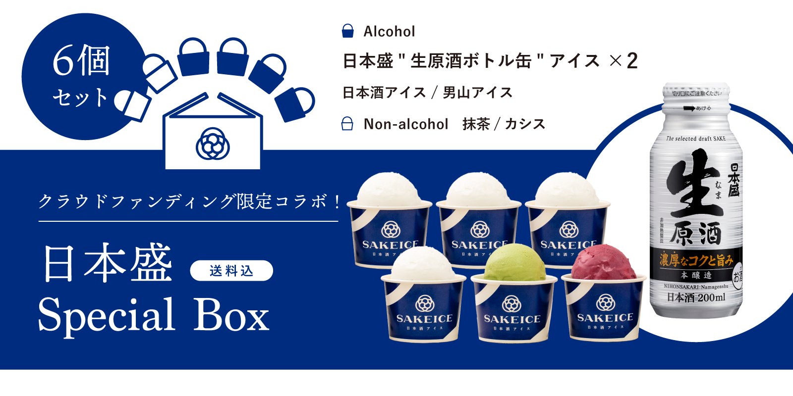 『SAKEICE』のクラウドファンディングは残り7日となりました。これまでの支援総額は目標の730%に達し、350人以上の方々に応援していただきました。できたばかりのお店にも関わらず、ここまでたくさんの方にご支援いただきましたこと心から感謝申し上げます。今回、新たに追加リターンとして”日本盛 Special Box”通販セットが登場します!日本盛株式会社は日本一の酒どころ兵庫県・西宮で日本酒造りを手掛ける、伝統と歴史のある老舗酒蔵です。「もっと、美味しく、美しく。」をスローガンに掲げ、130年以上も日本酒業界をけん引していらっしゃいます。日本盛の”生原酒ボトル缶”は、いくつものこだわりがある業界初の日本酒です。・生酒(加熱処理を行わないため、日本酒本来の鮮度溢れる風香味が楽しめる)・原酒(アルコール度数を調整する「割り水(希釈)」を行わないため、深みのある豊かで濃厚な味わいが楽しめる)・生原酒をいつでもどこでも美味しく飲むことが出来るアルミボトル缶容そんな日本盛“生原酒ボトル缶”は全部で4種類あり、その中の「本醸造」を練りこんだアイスは、生原酒ならではの贅沢なコクと旨味・しっかりとした味わいを楽しめます。SAKEICEと日本盛の初コラボによる、新しいSAKEICEで伝統の味わいをご体験ください!