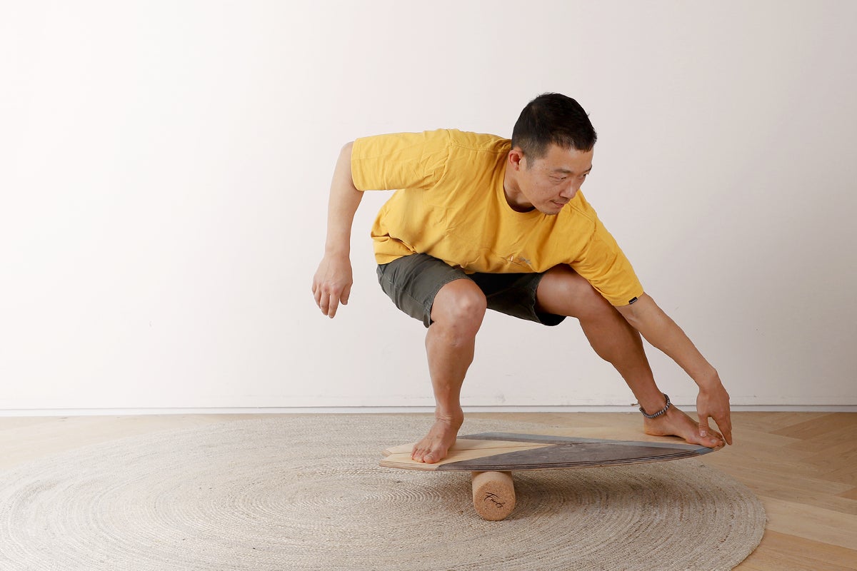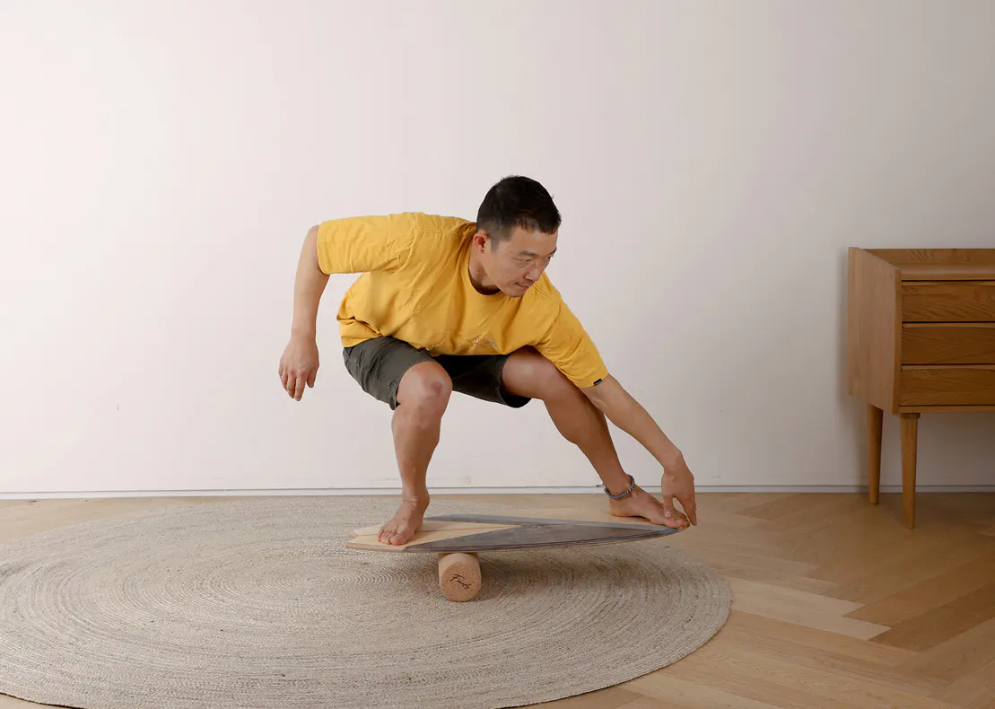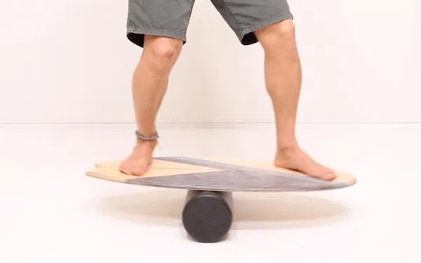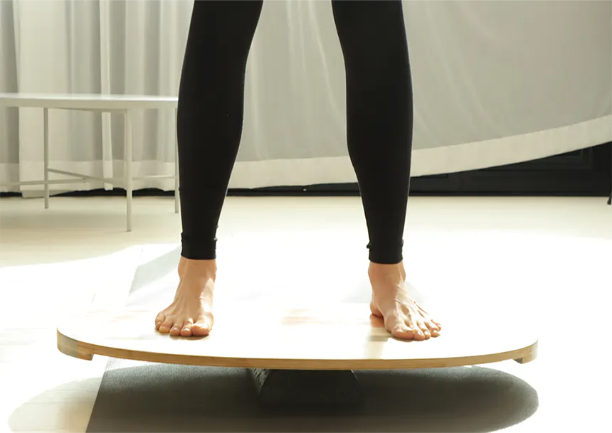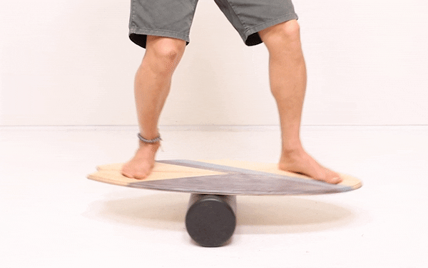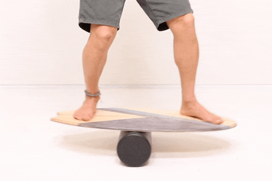 -バランスボードでトレーニングをする際、そのまま前後に行ったり来たりするのではなくコアに力を入れて重心を維持した状態で、自分の好きな方向に重心移動できるよう練習するのがお勧めです。