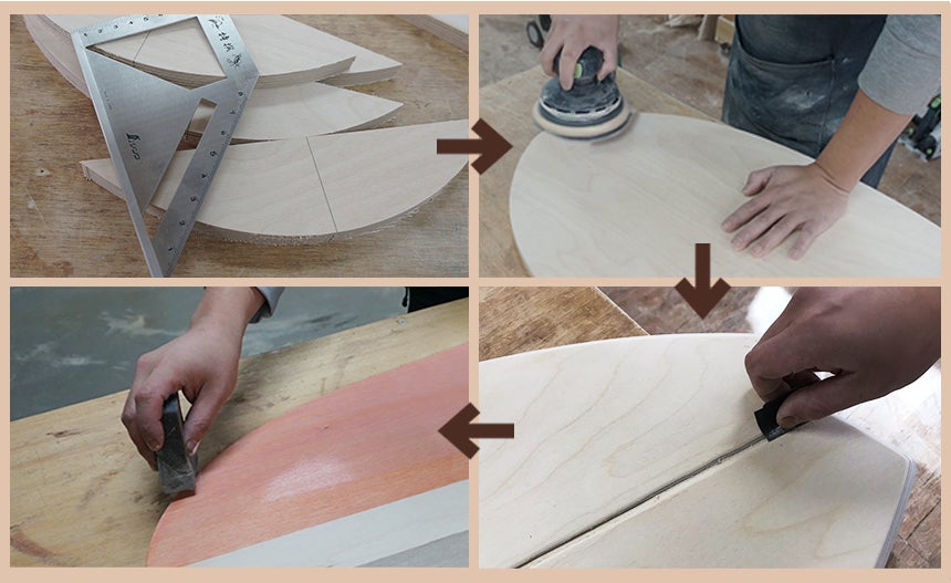 資材入庫:フィンランド産の白樺を使用しています。→裁断及びカッティング→1次サンディング→2次サンディング→下塗り→中塗り&乾燥作業→ロゴ作業→上塗り→仕上げサンディング→最終乾燥