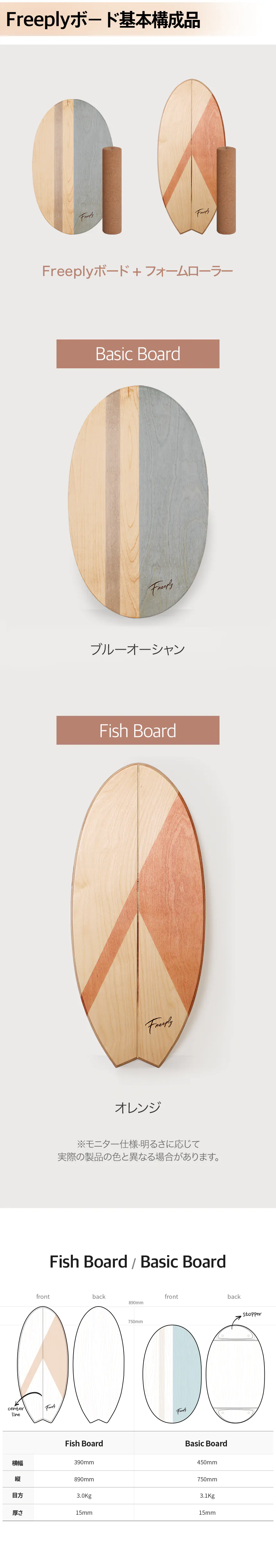 ・Freeplyボードは全ての製品が手作り製作され、色や柄などに製品ごとに違いがあり、これは製品の瑕疵や交換対象ではありません。