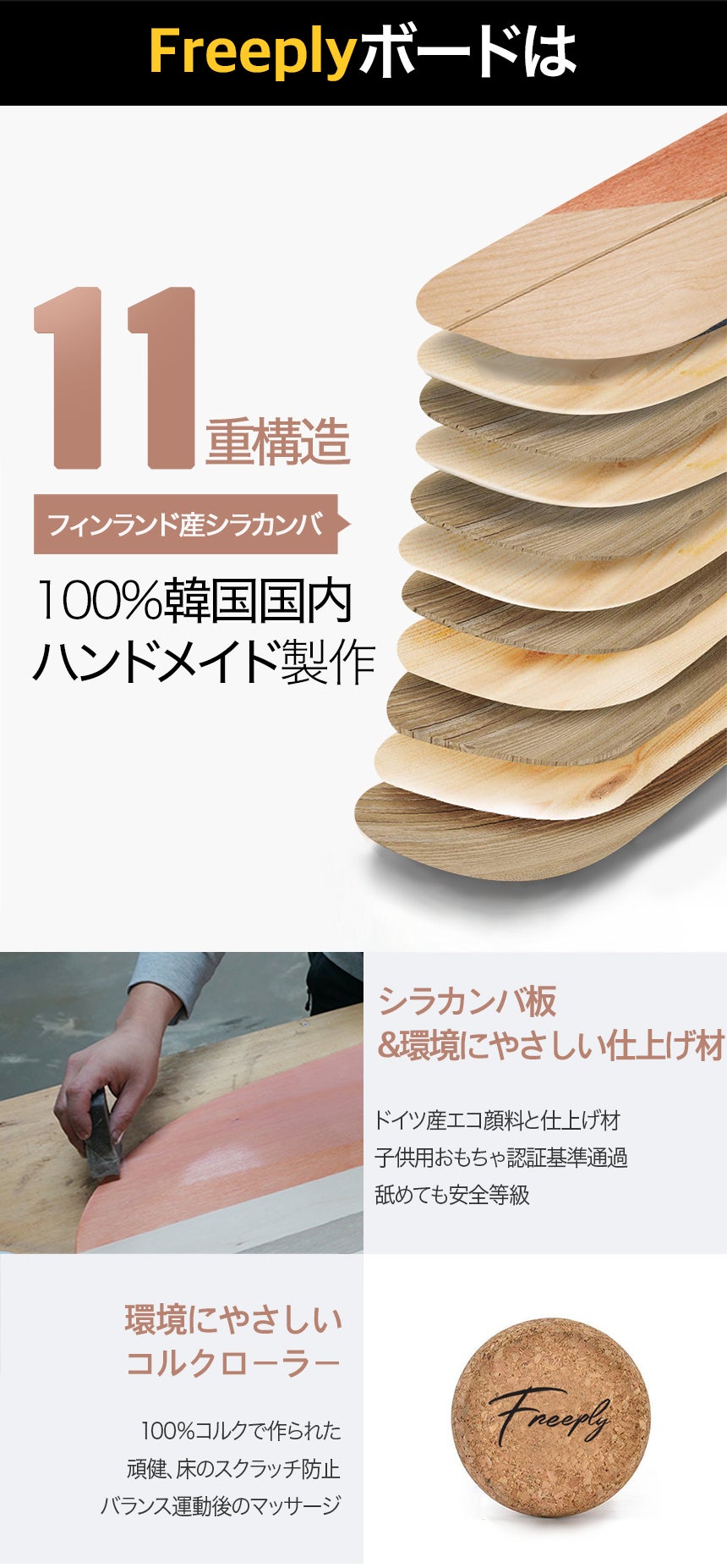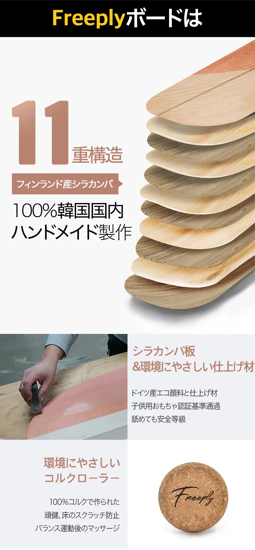 バランスボードを作るため、3度の塗装作業をします。3度の塗装作業 から、少なくとも24時間の乾燥時間が必要です。工程ごとの品質を上げるため3 度のサンディング作業をします。プレミアム製品を作るために最善を尽くしています。