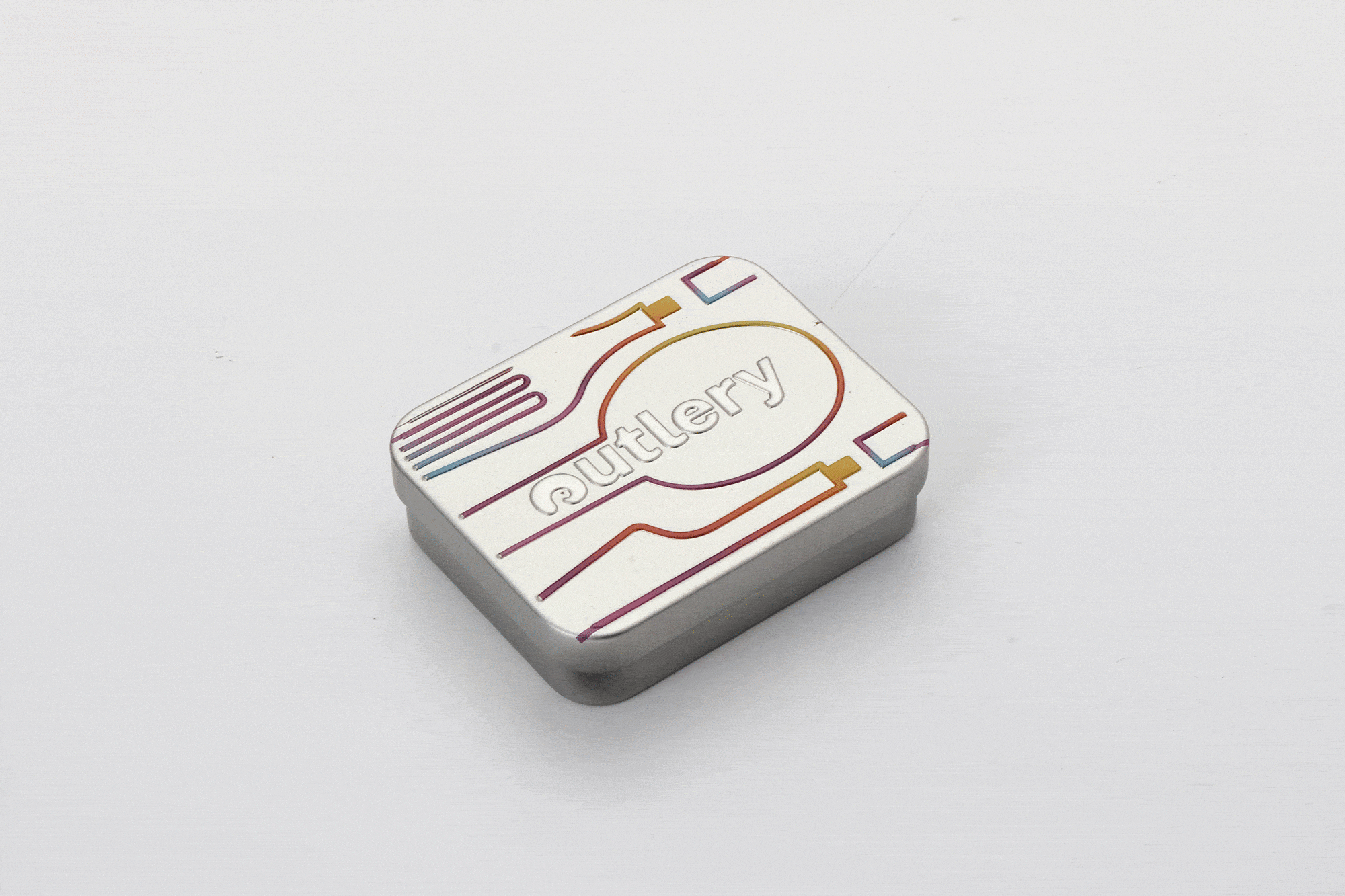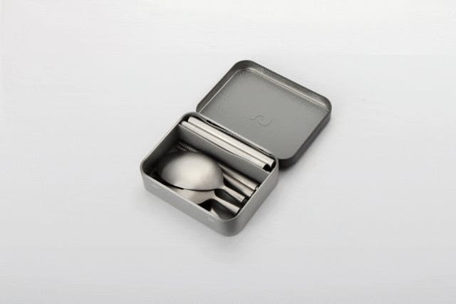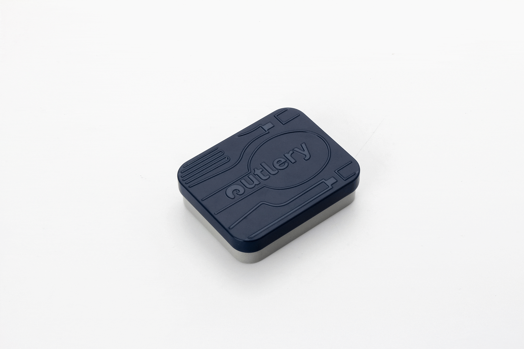 (3)プラスティックフリーの徹底!Outleryは、カトラリーとお箸の部分がステンレススチール、ボックスの素材がリサイクルの錫でできています。