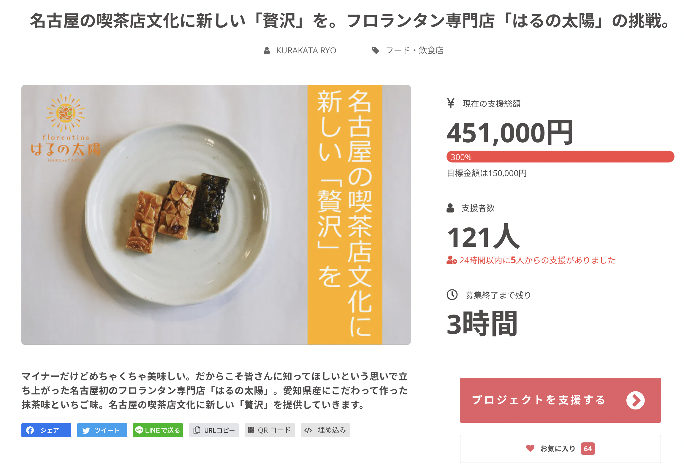 こんにちは。名古屋初のフロランタン専門店「はるの太陽」です。皆さんからご支援いただきましたものは全て配送させていただきました。一部の方は配送が遅れてしまい申し訳ございません。(もしまだ届いていないという方がおりましたらご連絡ください)予想以上の反響があり、私たちもびっくりしていました。また「美味しい」とメールをいただいたり、TwitterやInstagramやFacebookにて私たちの商品を紹介していただいたり、皆さんのお声を聞いて非常に嬉しく思います。はるの太陽は今後は3つの軸で事業を拡大していきます。1つ目は「フレーバーの増加」です。7月からは、夏限定の新味として「塩レモン」味を発売しました。暑い夏にはこの塩レモン味がぴったりです。いちごとは違った酸味を感じることができます。また8月にも和風なフロランタンとして、新味を開発中です。2つ目は「実店舗での販売」です。当面はマルシェが中心となりますが、皆さんからのお声を大切にしたいと考えており、実店舗での販売を強化していきます。7月からは月に1回のペースで、名古屋地下街「ユニモール」での出店をします。そこで新味のお披露目販売もしていきます。是非ともご来場ください。3つ目は「健康に特化した新商品の開発」です。フロランタンは毎日食べたいけど、カロリーが気になる、、。といった声を多くいただいたことを踏まえまして、「毎日食べてもいい健康に特化したフロランタン」の開発を行っております。商品の完成と販売は10月を見込んでおります。こちらもまたクラウドファンディングでプロモーションしていきます。完成までお待ちください!!引き続き私たち「はるの太陽」のフロランタンをよろしくお願いします。https://harunotaiyo.com