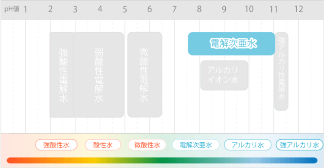 次亜塩素酸ナトリウムは強アルカリ性で危険ですが、電解次亜水は弱アルカリ性(PHは7-8程度)なので、漂白作用やタンパク質腐食作用がほとんどありません。