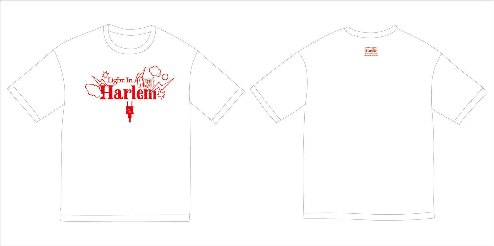 お待たせ致しました。「Light In West Harlem」T-SHIRTSデザイン(ホワイト)あがりました。ご確認のほどよろしくお願いいたします。