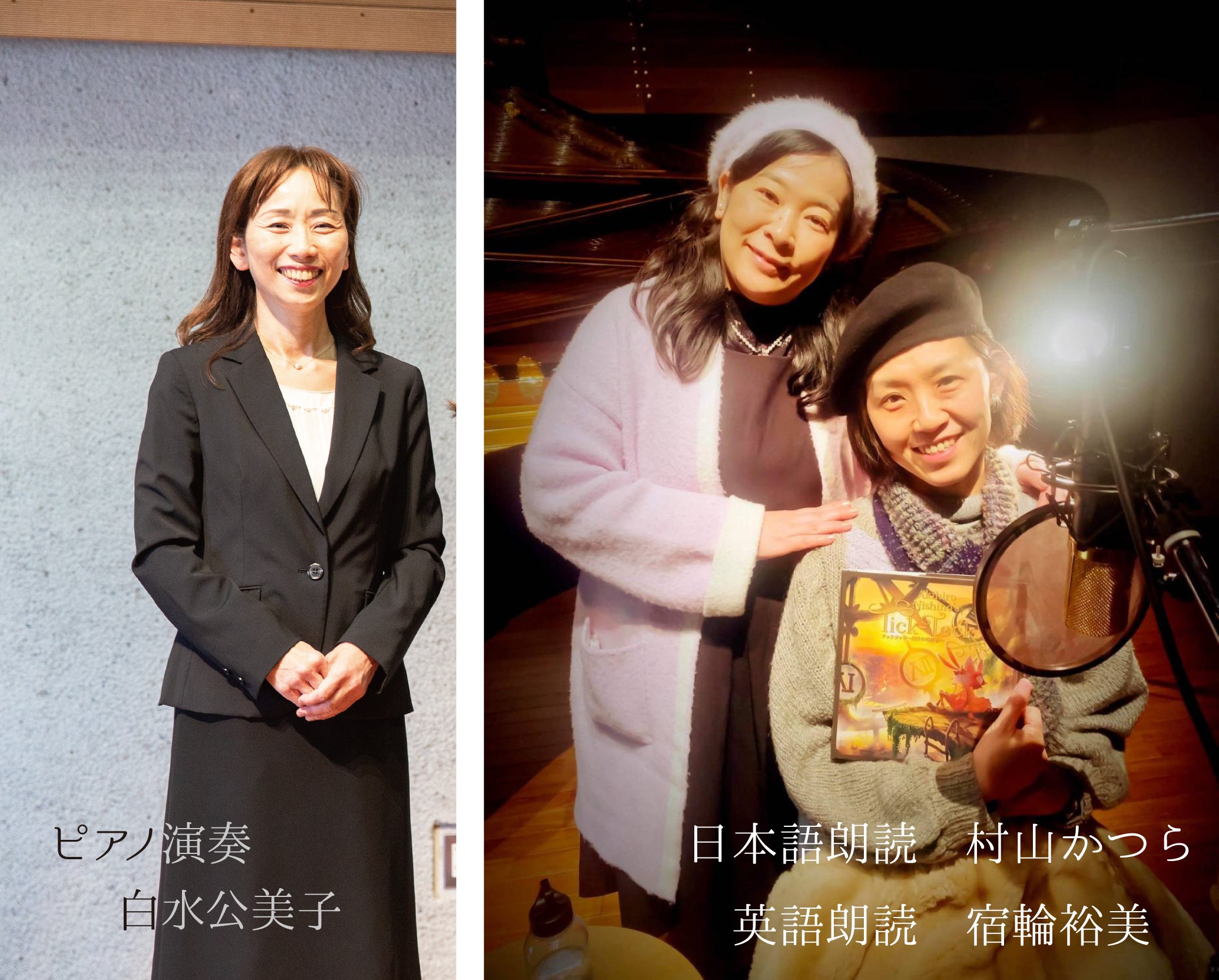 人々が集う「待ち合わせの場」となれるよう、そして「夢を叶えられる場」であり続けられるよう挑戦する私たち武蔵ホールにとって、これ以上にピッタリの題材はありませんでした。ピアニストであり当ホール館長である白水公美子の どこまでも寄り添うようなピアノに乗せて、ソプラノシンガー村山かつらさんによる優しくあたたかな日本語朗読、ひまわり英語教室主宰の宿輪裕美さんのクリスタルのように澄んだ英語朗読をそれぞれ約25分に収めてお届けします。