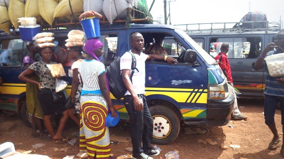 乗合バスの出発を待つDFPリベリアコーディネーターのウインストン。ここからフィールドに着くまで、ずいぶんと時間がかかってしまいます。バイクさえあれば…!(つづく)